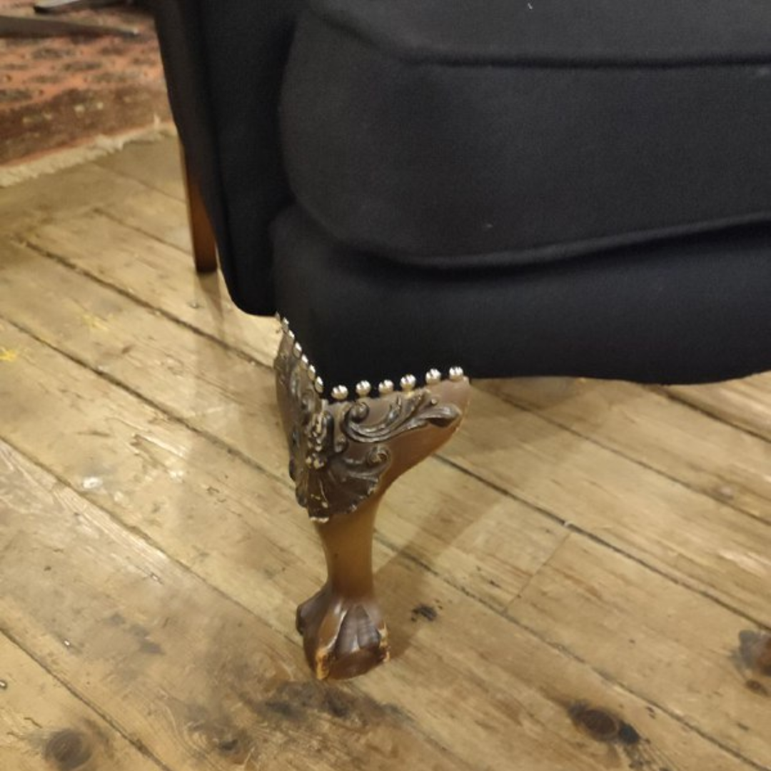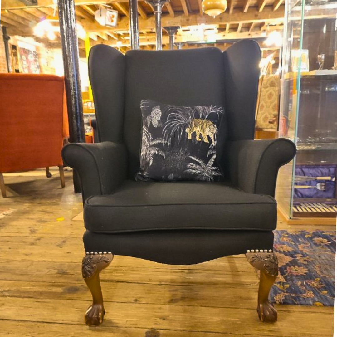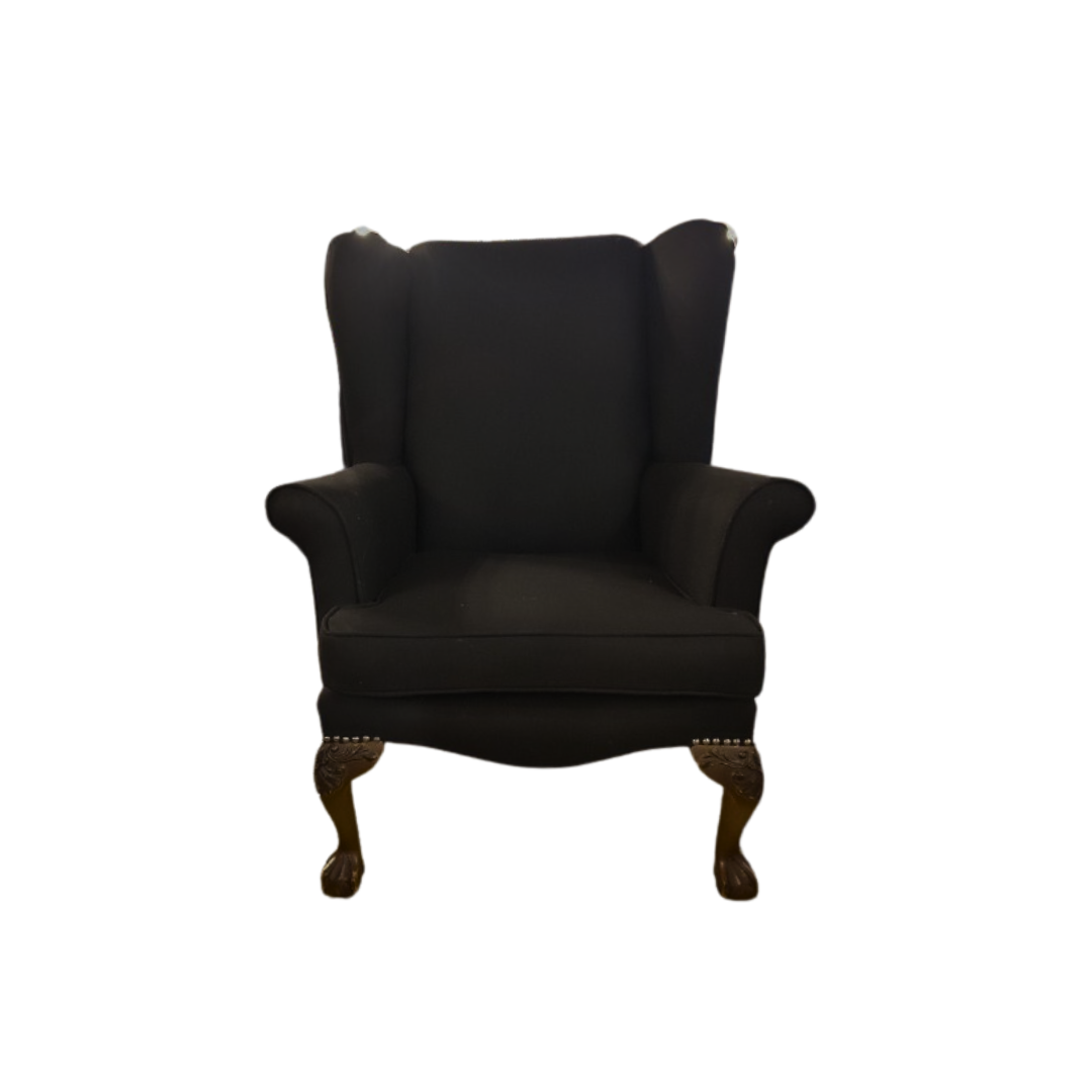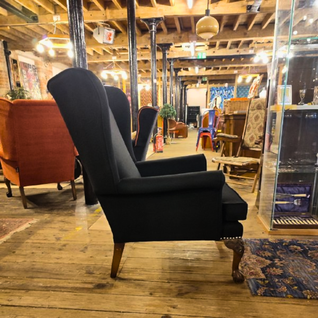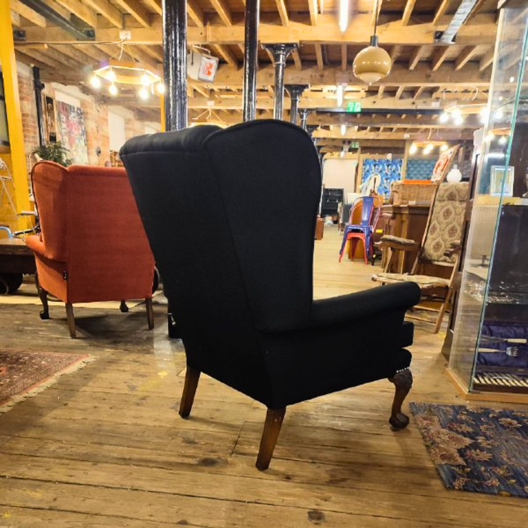 Step into the allure of the 1960s with our exquisite Lounge Chair, a true embodiment of mid-century design. This Fireside Chair, featuring a high back and wingback design, sits gracefully on Queen Anne legs, intricately adorned with floral work on the front legs. Crafted from ebonised beech wood.