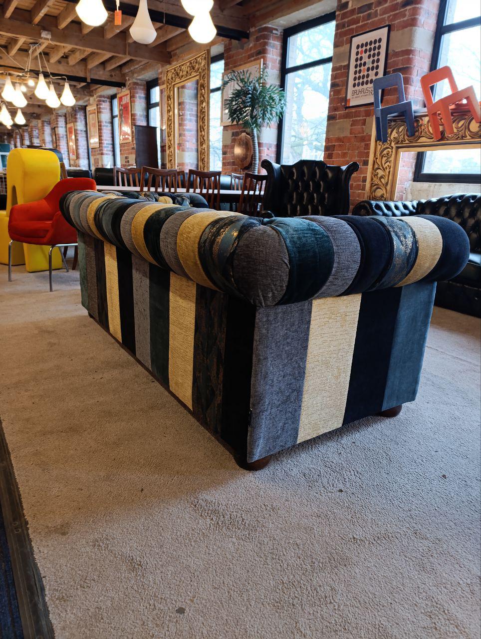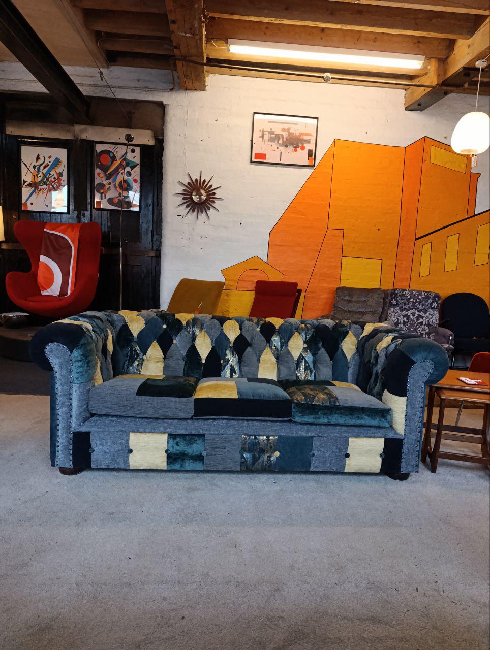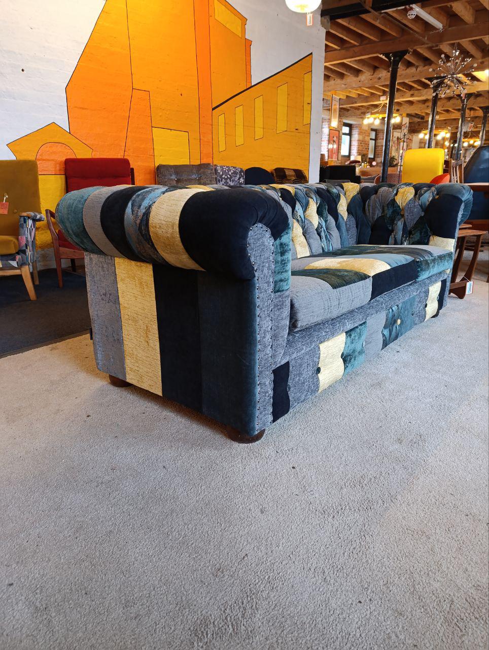 Timeless Design: A classic Chesterfield with a vibrant patchwork twist.