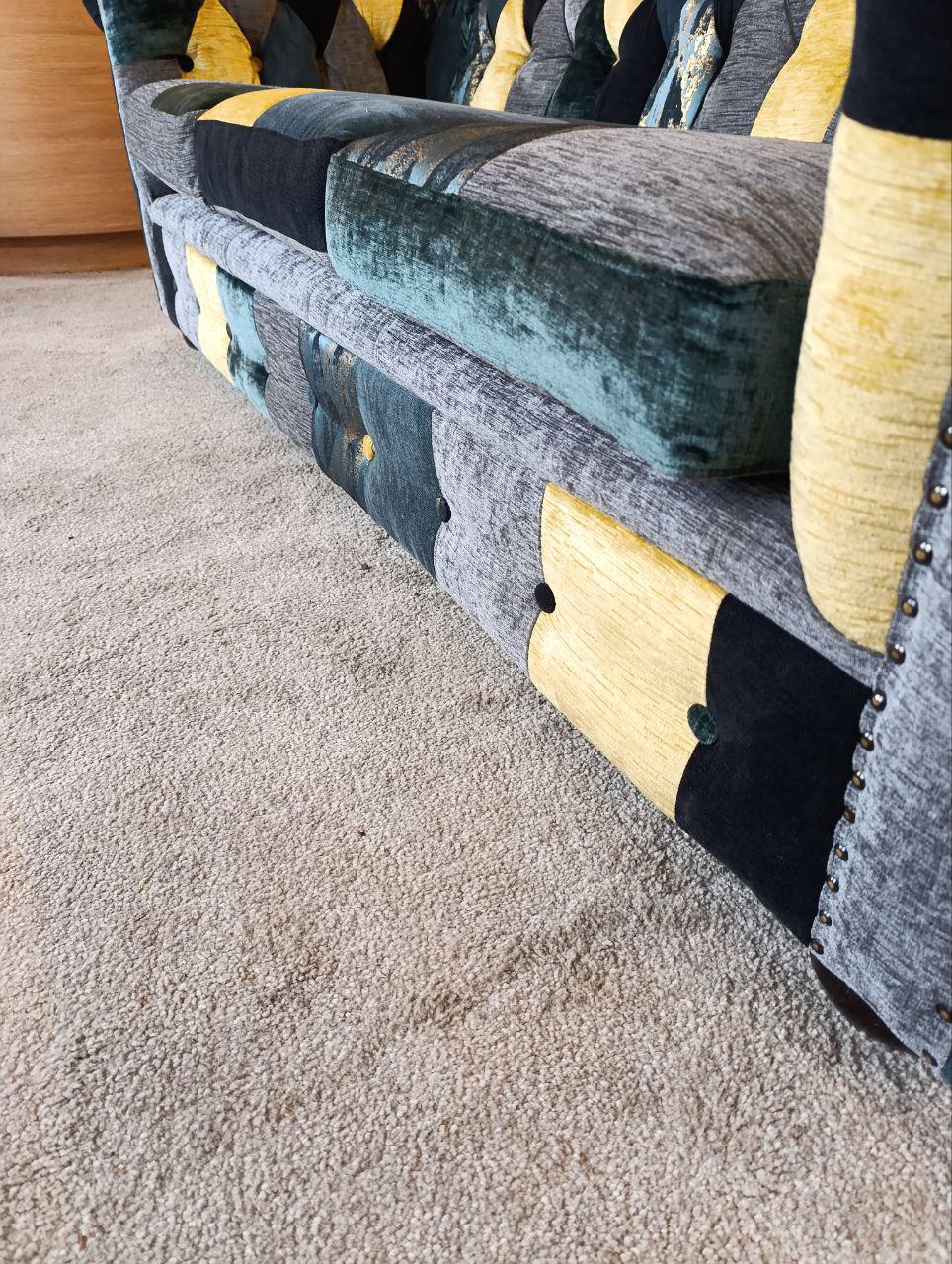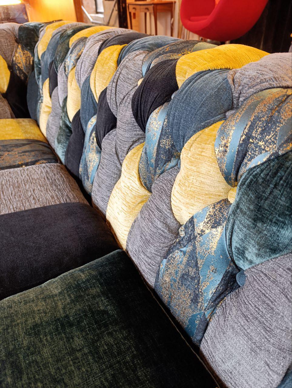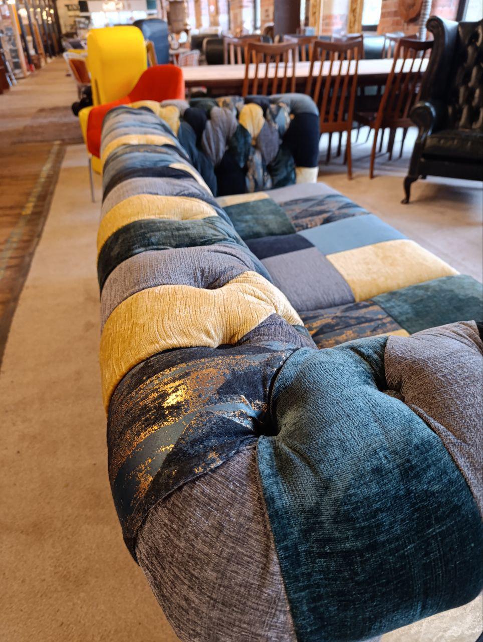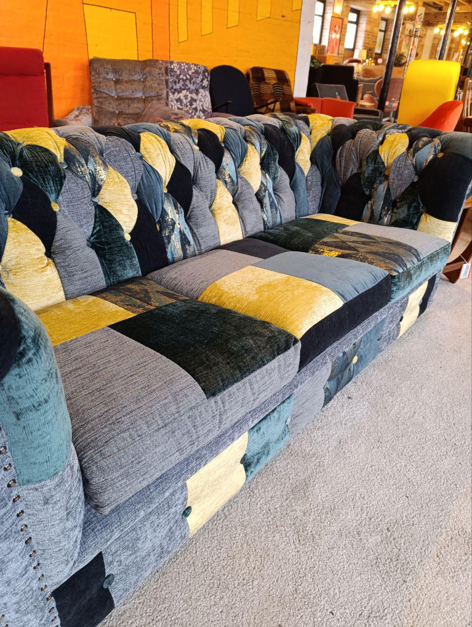 The sofa has been completely reupholstered in durable fabrics, ensuring both longevity and comfort. The patchwork design combines soft textures and vibrant colours, while the studded detailing and buttoned back showcase the meticulous craftsmanship behind this piece.