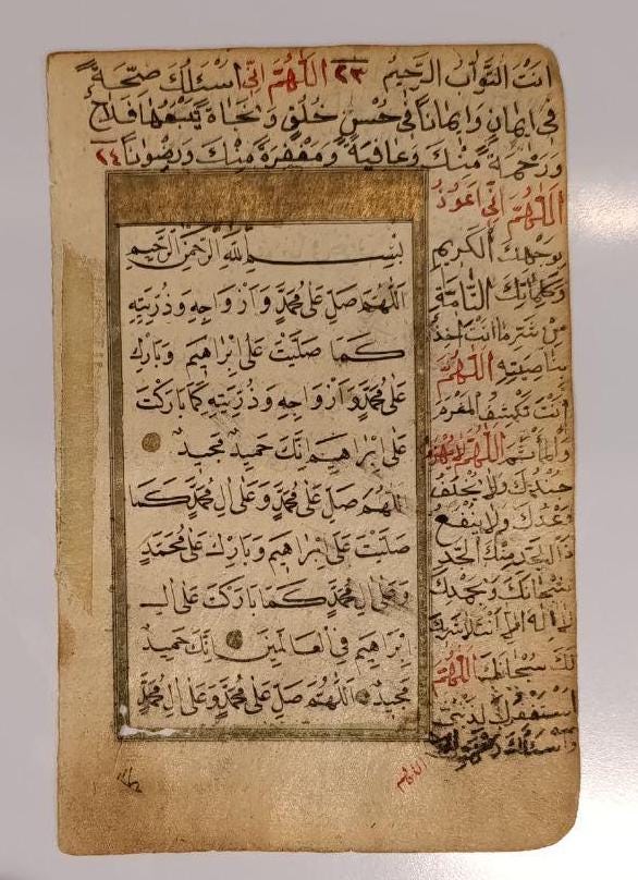 This beautiful framed folio is a precious piece of Islamic devotional art and literature, offering a tangible connection to centuries of spiritual tradition. Handwritten in elegant black naskh script, this folio features verses from the Dala'il al-Khayrat, a renowned collection of prayers for the Prophet Muhammad (peace be upon him), composed by the Moroccan scholar Muhammad al-Jazuli (d. 1465 CE).