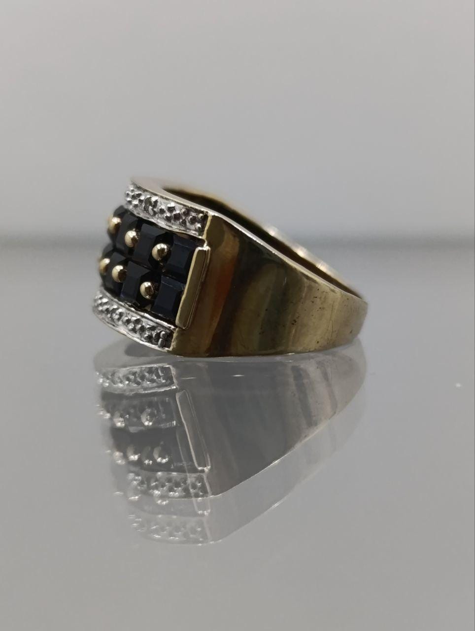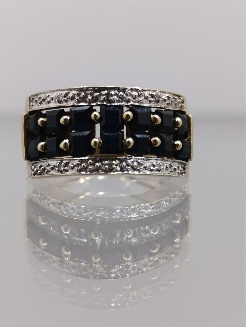 This elegant 9ct yellow gold ring features a captivating display of 14 princess-cut sapphires. The vibrant blue gemstones create a dazzling sparkle, making this ring a beautiful and eye-catching piece.