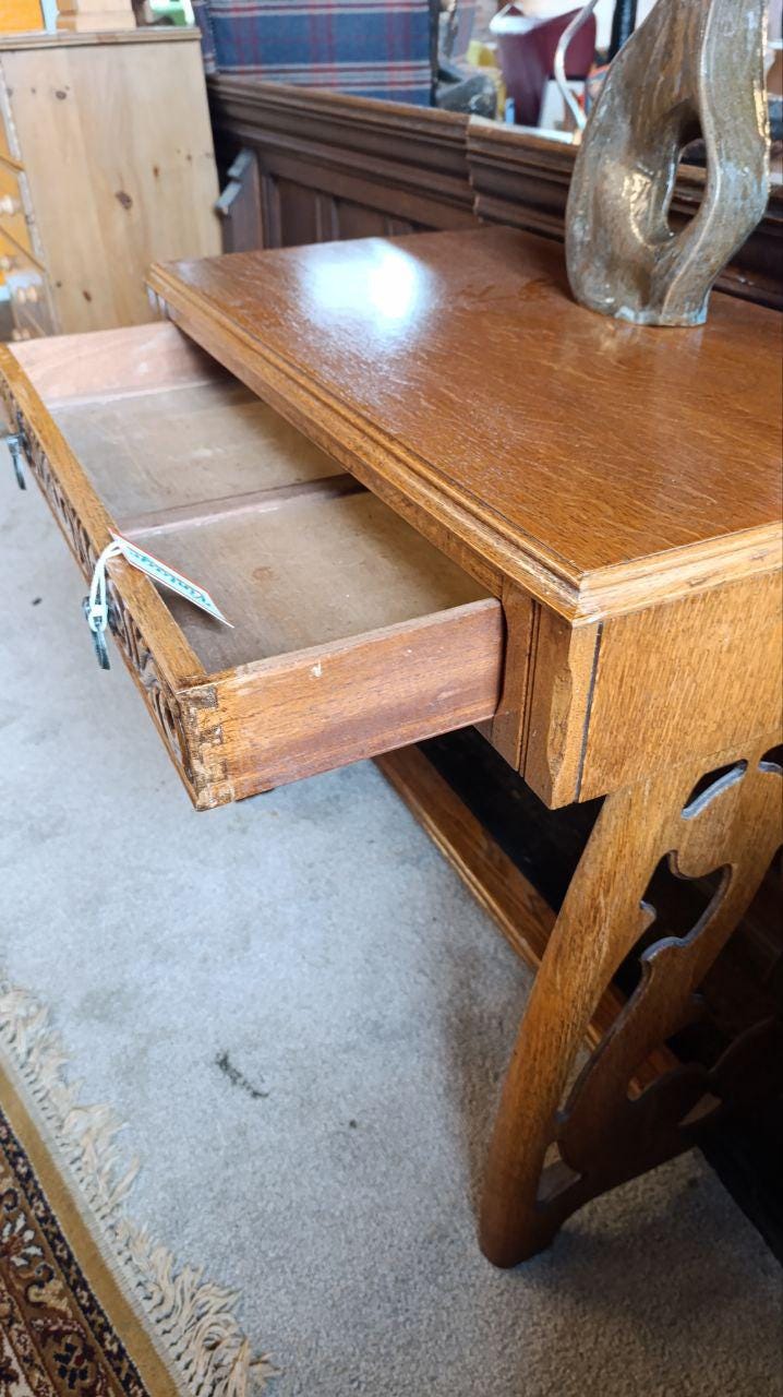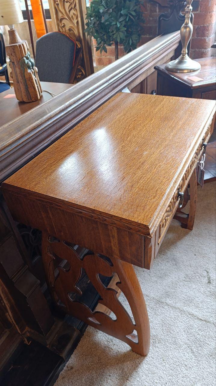 A striking Arts & Crafts Revival oak veneered console table, dating from the mid-20th century. The table features a boldly carved frieze drawer with foliate decoration, supported by shaped pierced side panels in the Arts & Crafts manner. The top is finished in oak veneer laid over solid timber, a mark of quality construction from this period. With its rich warm patina, iron ring handles, and distinctive design, this piece captures the spirit of the Arts & Crafts movement while offering practical modern use as a hallway, living room, or decorative console table.