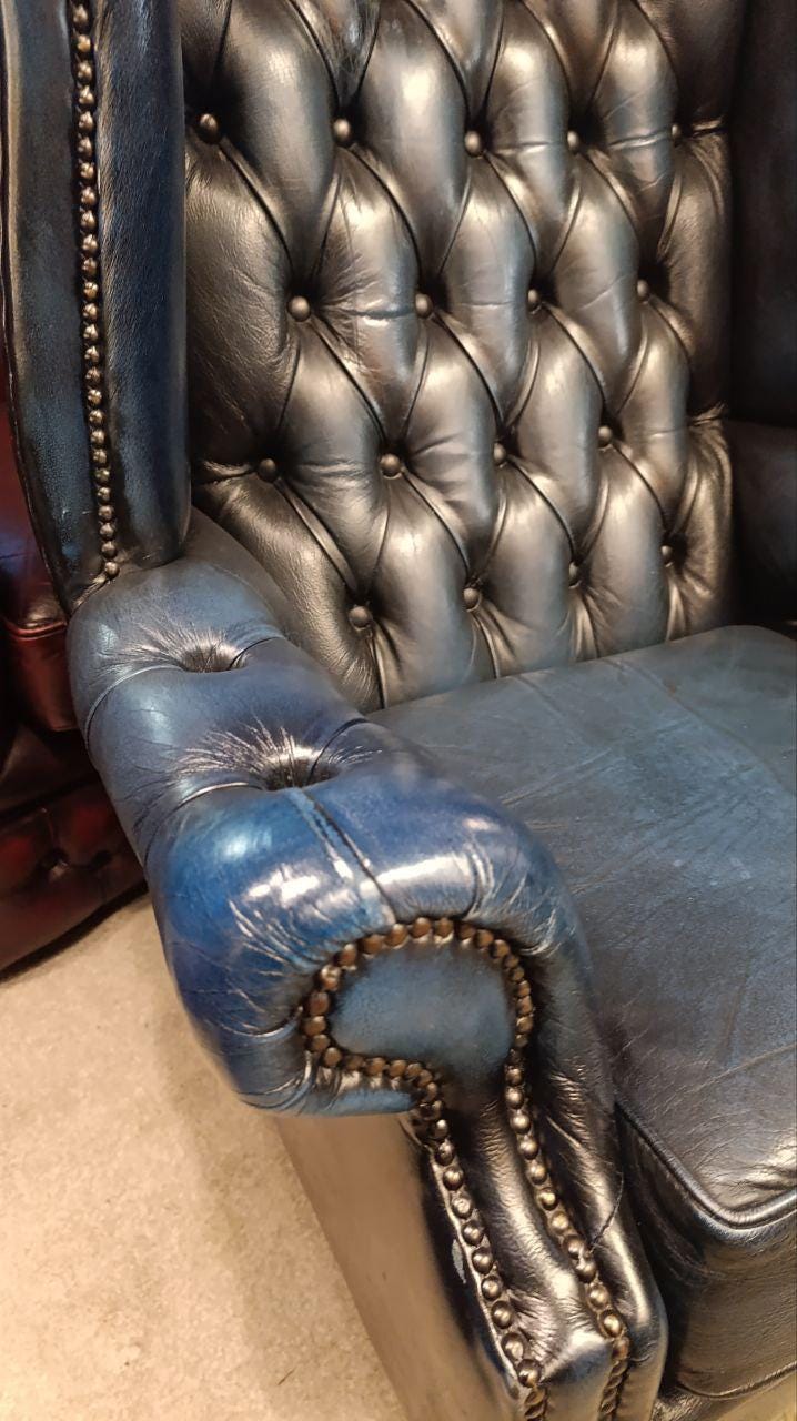 A striking Chesterfield wingback armchair upholstered in richly hand-dyed blue leather, combining traditional British upholstery craftsmanship with a distinctive and highly sought-after colour palette.