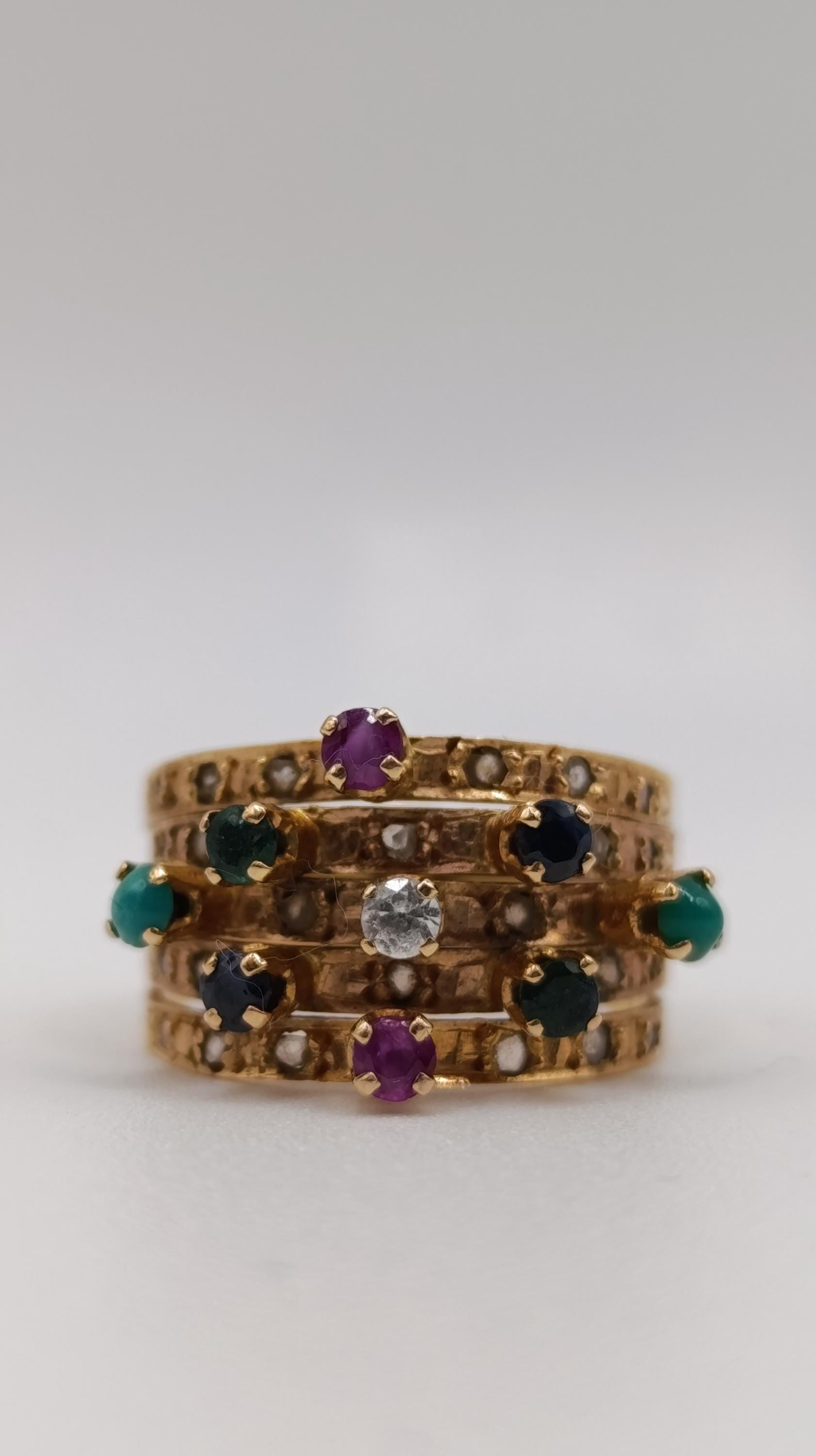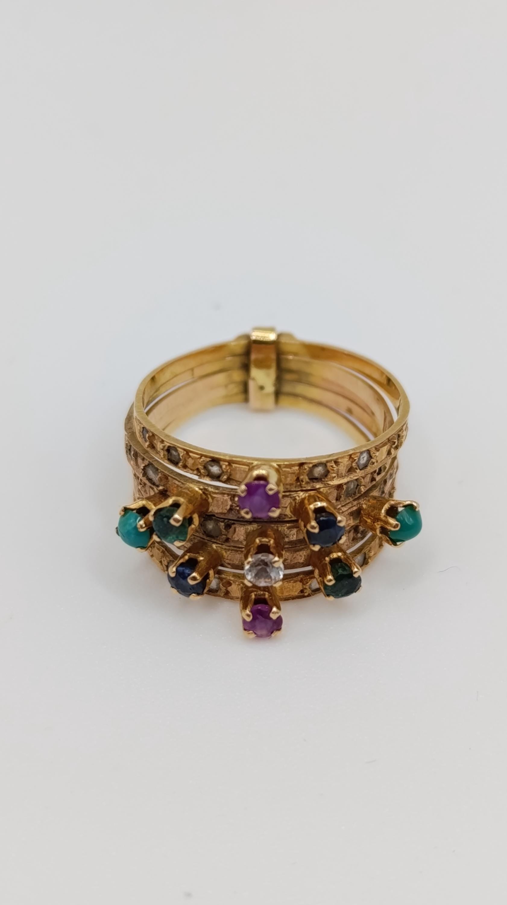 A rare and important Edwardian period (early 20th century) suite of five independent stacking rings in 18ct yellow gold, designed to interlock with a gold loop at the back. Together, the bands form a striking diamond-shaped motif when stacked, showcasing a combination of rose-cut diamonds and precious gemstone accents including sapphire, ruby, turquoise and emerald, along with pearls.