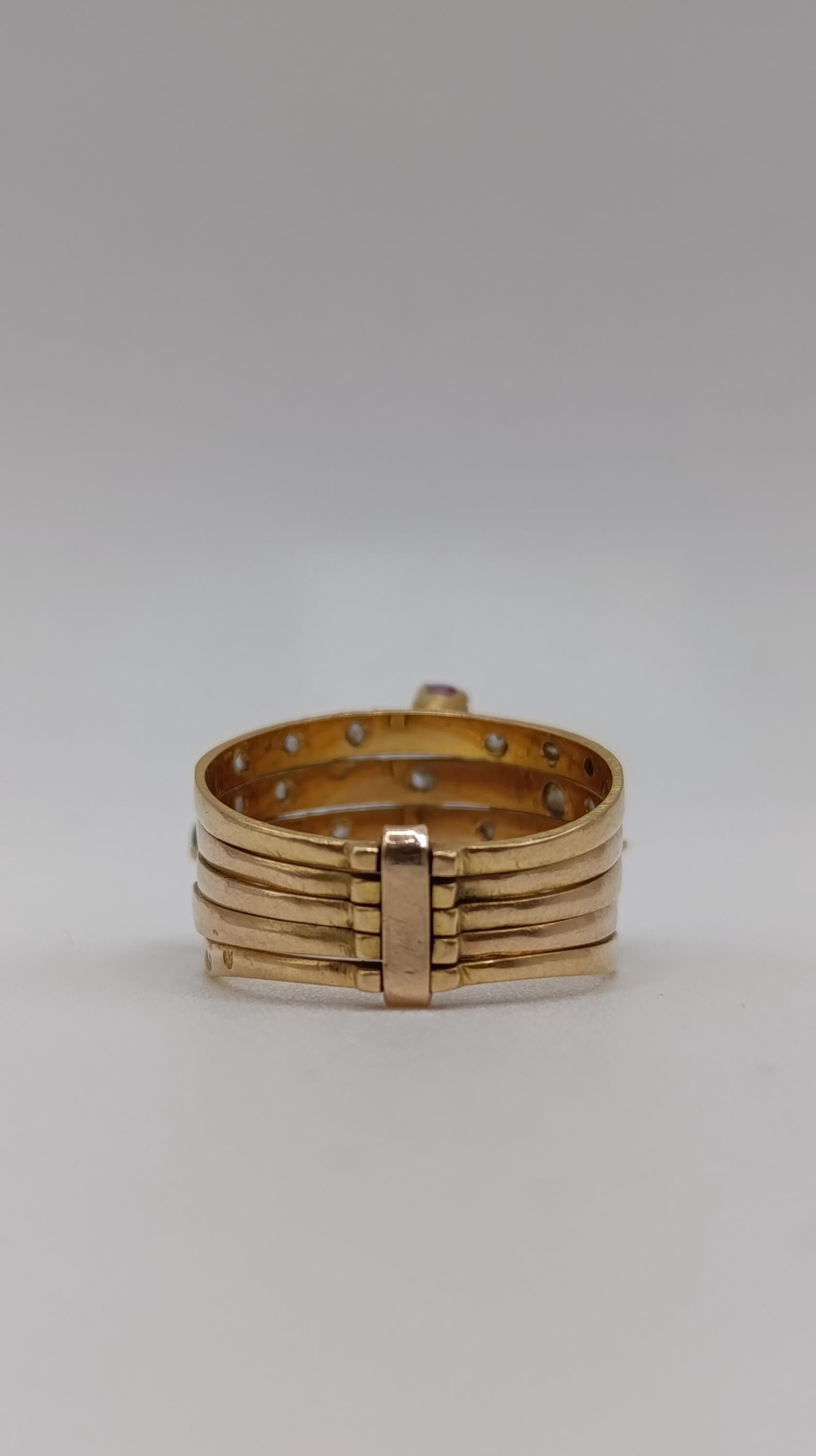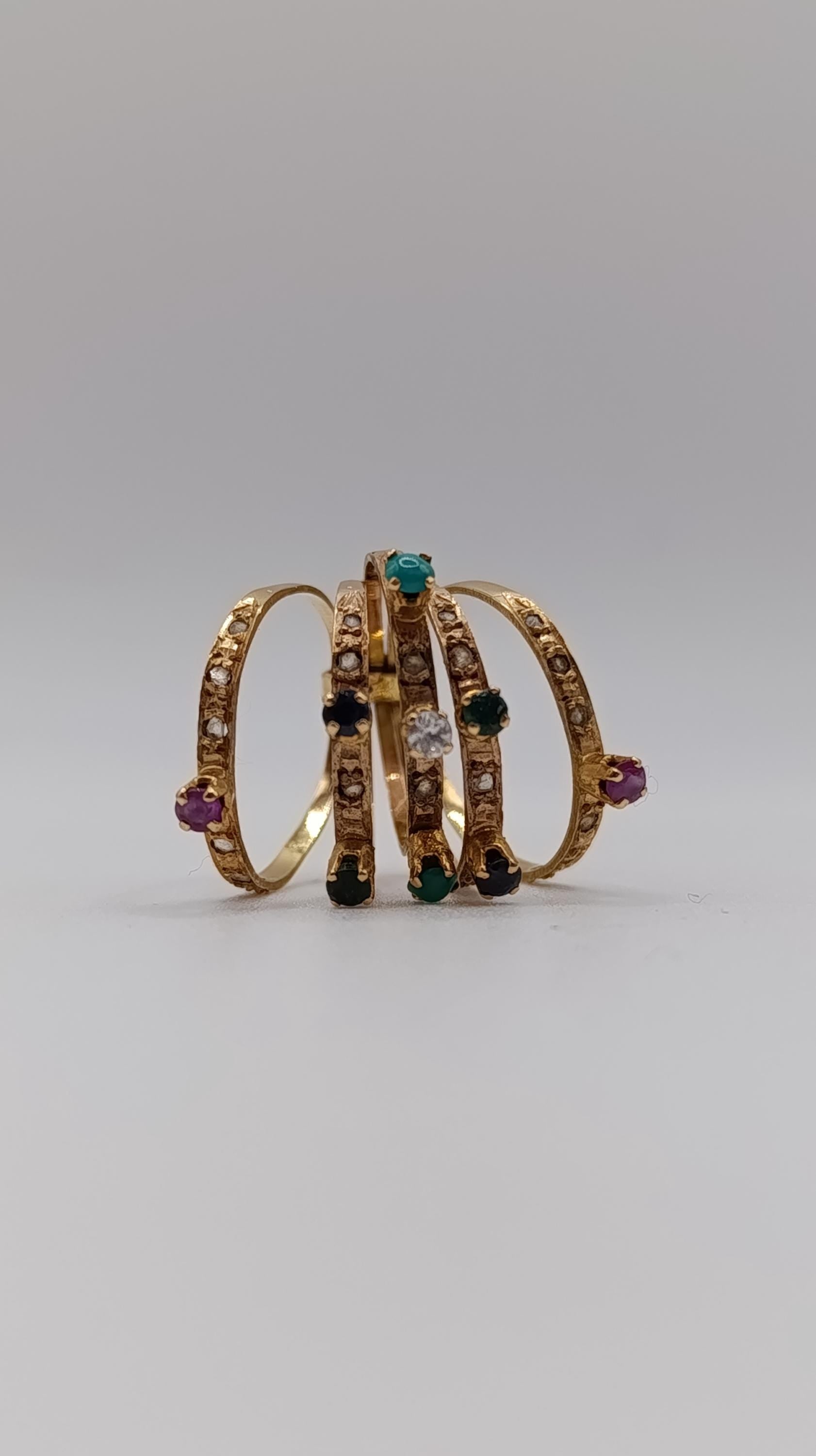 The finely worked half-eternity bands are set with shimmering rose-cut diamonds, enhanced by the vivid hues of the central gemstones. This ingenious design allows the rings to be worn individually or as a complete statement piece, embodying the playful yet elegant spirit of Edwardian jewellery. Stamped with an Arabic 18ct mark, this piece carries both cultural and historical resonance, making it a significant collector's item as well as a wearable artwork.