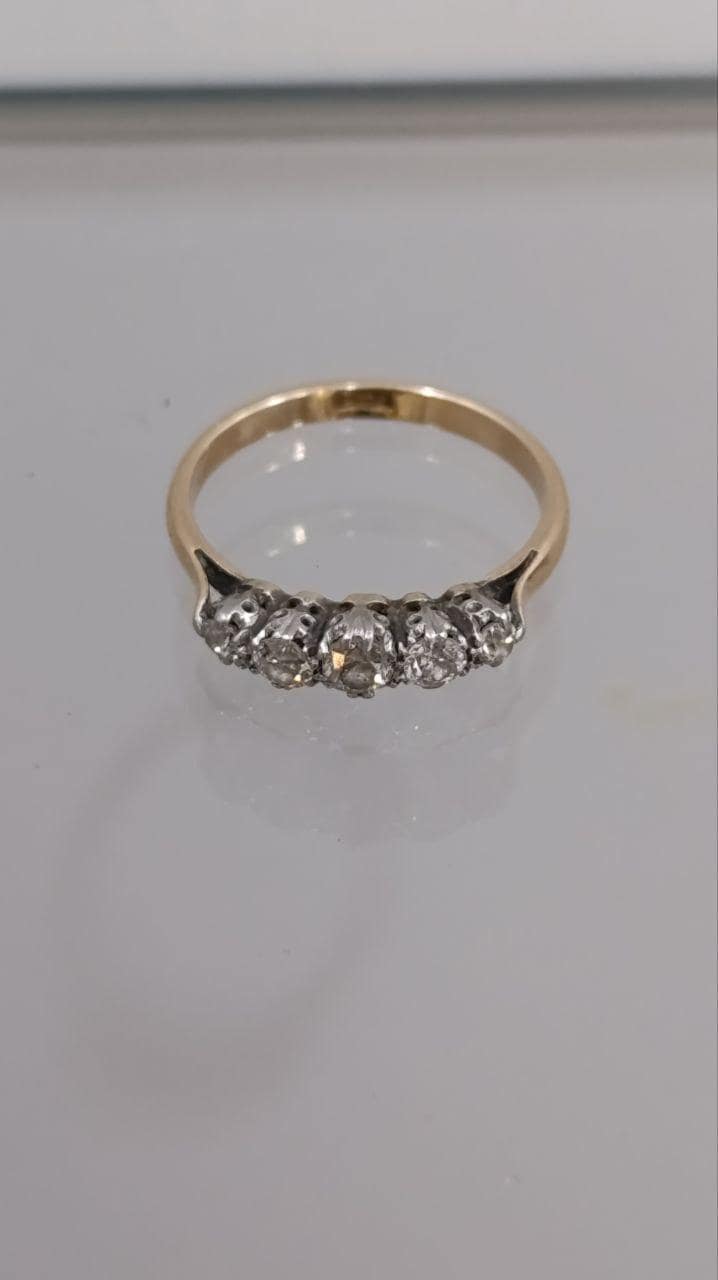 Crafted with meticulous attention to detail, the gallery of this ring is a contrasting white platinum, beautifully setting off the dazzling diamonds, while the shank is in rich 18ct yellow gold. This exquisite combination of precious metals adds depth and allure to the design. The central diamond, roughly 0.25ct, is perfectly flanked by two pairs of diamonds, progressively reducing in size, creating a harmonious and captivating display of light.
