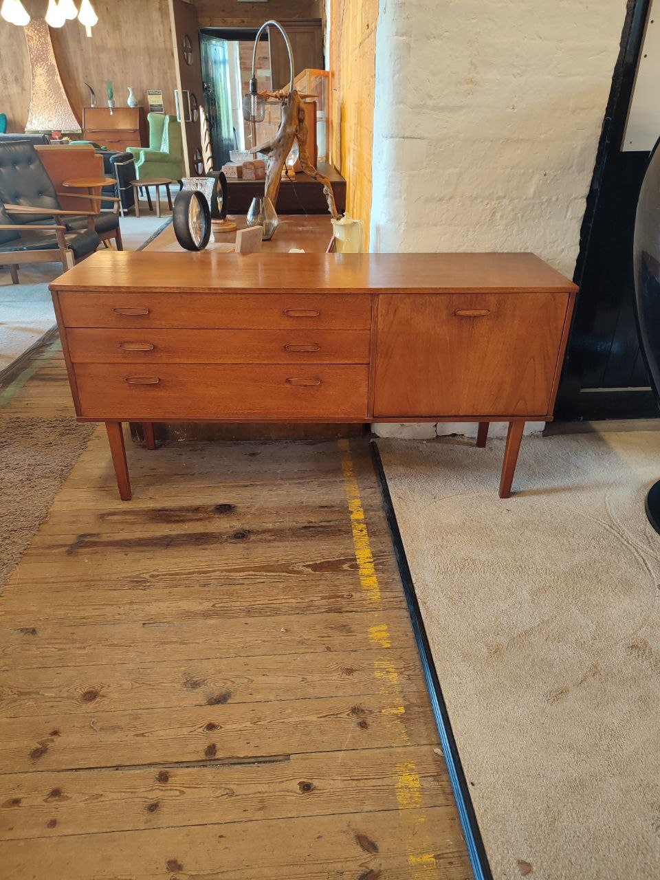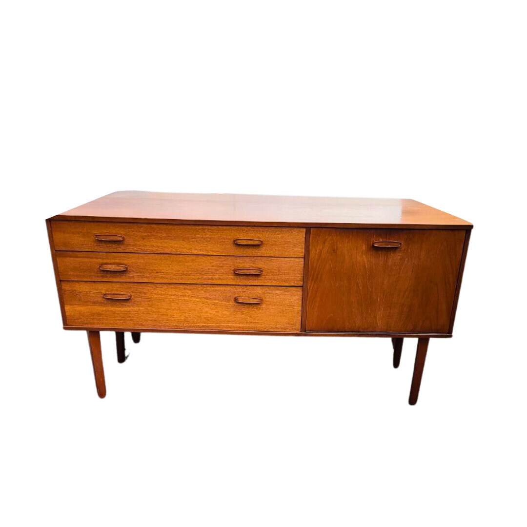 Renowned for its remarkable simplicity and clean style, this piece features a beautiful light teak veneer finish, enhanced by its rich colour and wood grain. The sideboard is meticulously designed with square spindles and simple ovoid handles, exuding a refined aesthetic. It offers ample storage with three long drawers of varying heights, the top drawer lined with felt and equipped with removable compartments. The right side houses a cupboard with a drop-down door, providing additional space with a removable shelf. Raised on high legs, this sideboard has a light, uncluttered presence, making it a perfect addition to any room. Expertly constructed with dovetailed drawers and hardwood runners, it stands solid and free from structural issues or woodworm.
