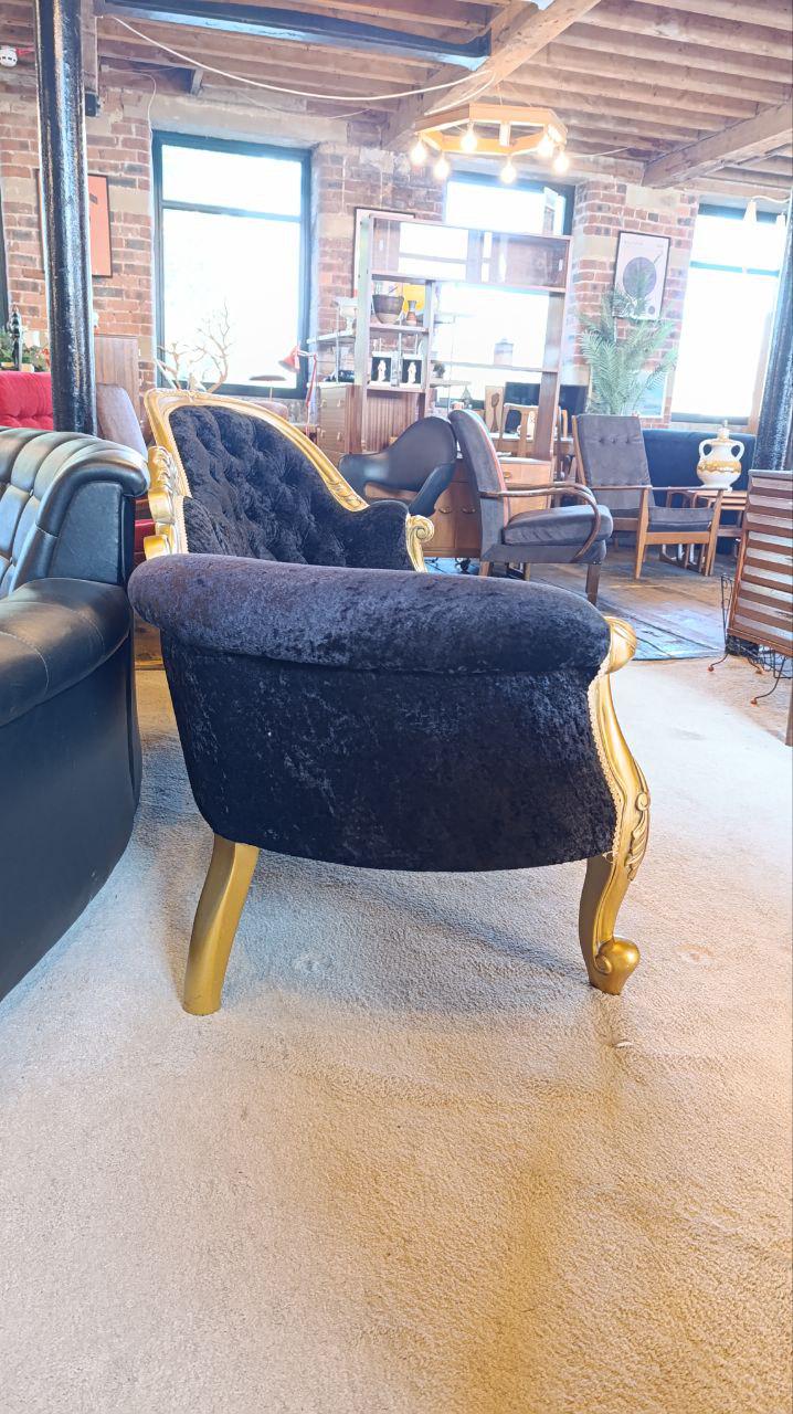A refined Rococo Revival giltwood chaise longue, likely French or Italian, dating to the early-to-mid 20th century (c.1920s-1950s). The carved timber frame is finished in traditional gilding over bole and gesso, with natural fading and wear revealing the rich undertones beneath. Recently reupholstered in a plush dark purple-black chenille, this piece combines classic form with comfort. Its sweeping curves, button-tufted back, and scrolled arms embody the elegance of French Louis XV influence, making it a versatile statement for both traditional and eclectic interiors.