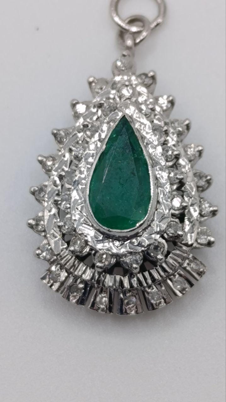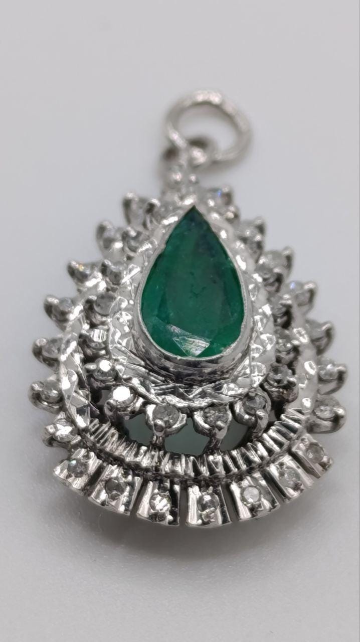 An exceptional white gold emerald and diamond pendant of teardrop form, dating to the mid-20th century (1950s-1970s).