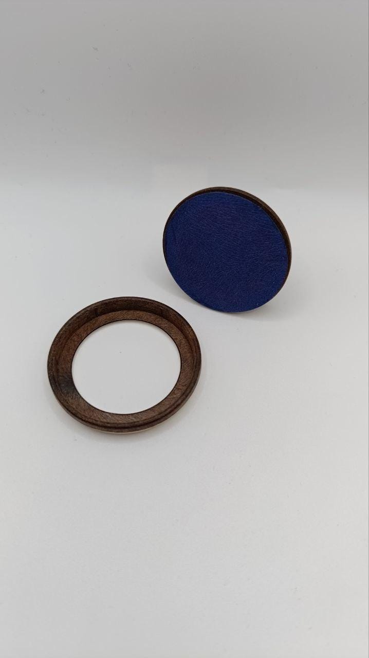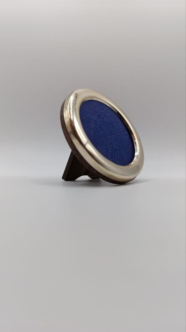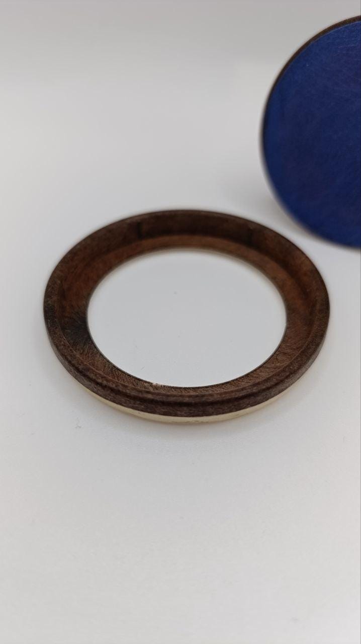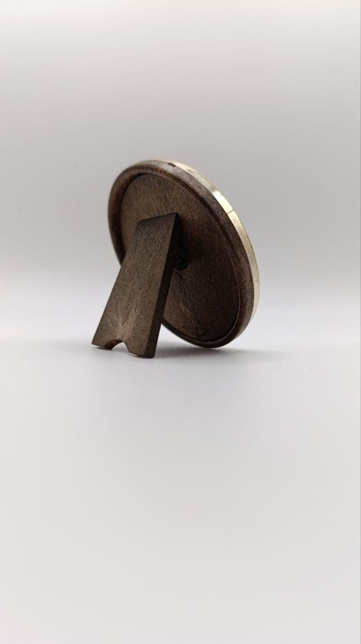A charming Italian sterling silver photograph frame, circular in form with a neat wood strut back. Measuring 57 mm diameter x 60 mm high, this miniature frame is perfectly suited for a portrait photograph or keepsake image.