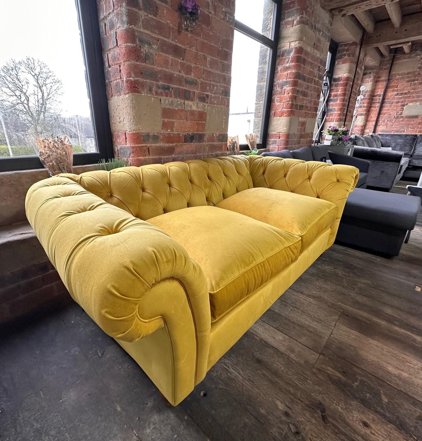 This stunning Chesterfield sofa is a perfect blend of classic design and contemporary luxury. Upholstered in a rich dark ochre plush velvet, this sofa offers a sumptuous and inviting feel. The elegant button-back design and sturdy wooden legs with turned front legs and a curved rear leg design add a touch of timeless sophistication. This sofa is in as-new condition, having never been used with brand new upholstery, and is ready to become a statement piece in your living room.