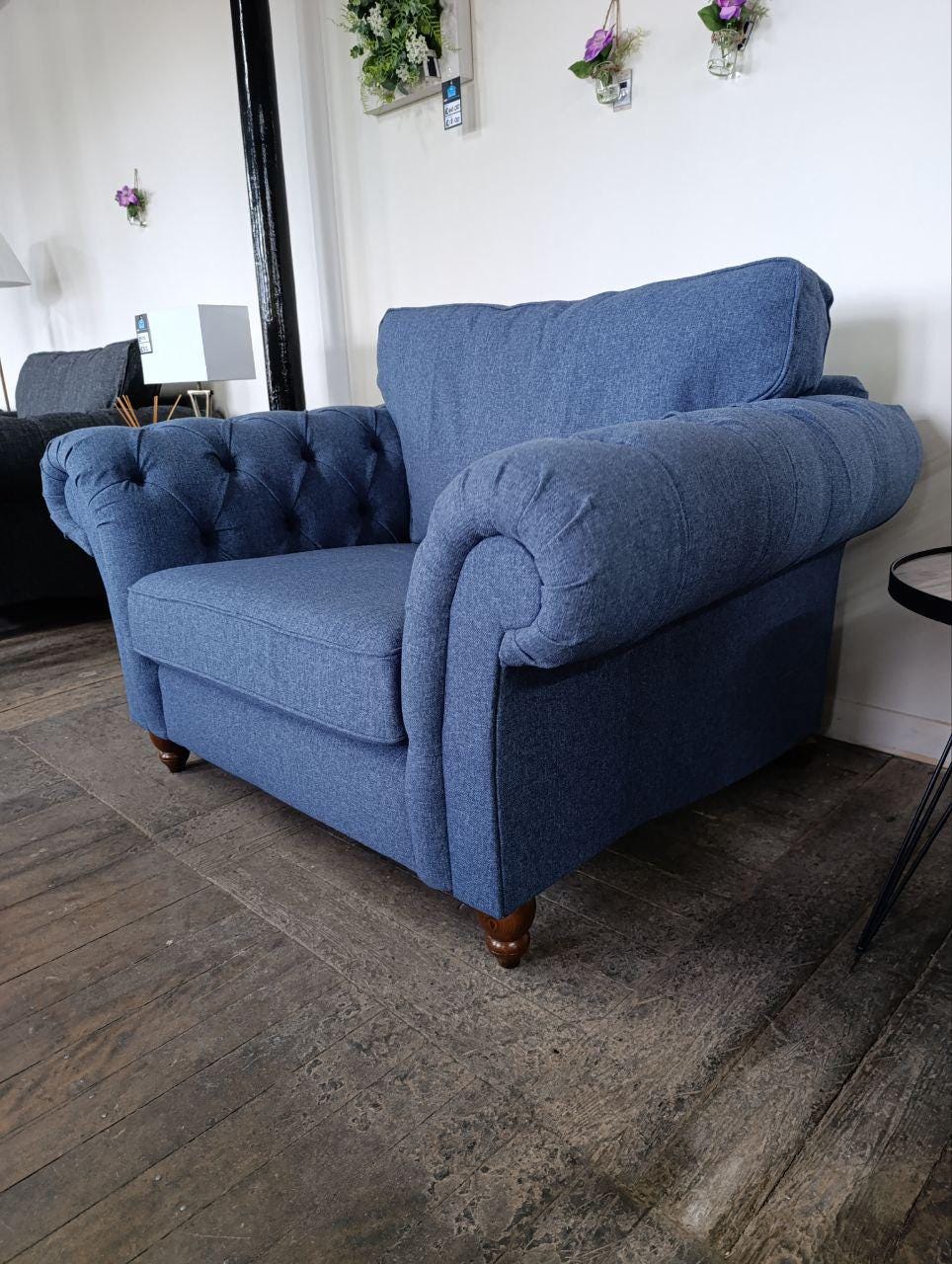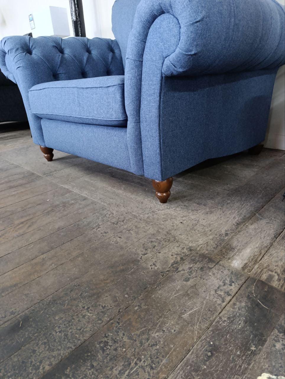 Indulge in ultimate comfort and timeless style with this stunning high-back Chesterfield style cuddle seat. Imagine sinking into its deep, generous proportions, enveloped in the soft and inviting touch of high-quality and hard-wearing blue chenille fabric. This chair is designed for luxurious relaxation, making it the perfect addition to any living room, snug, or reading nook.