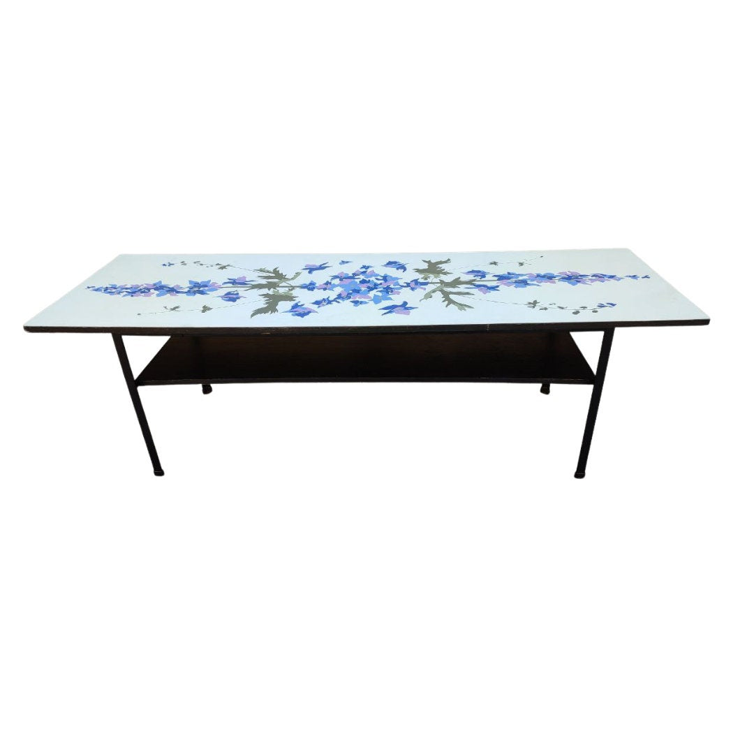 We are delighted to make available this delightful mid century floral design coffee table by John Piper for Terence Conran. The table top is finished with formica with a wood shelf below, all sat on a cast iron frame.