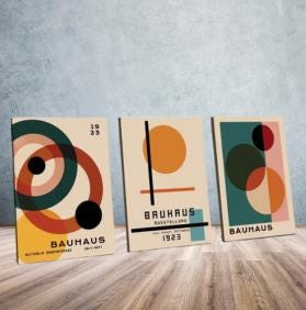 Elevate your space with this stunning set of three mid-century modern abstract canvas prints. Inspired by the iconic Bauhaus style, these prints feature bold geometric shapes and vibrant colours that will add a touch of contemporary flair to any room. The high-quality canvas is stretched over a pine wood frame, ensuring durability and a professional finish.