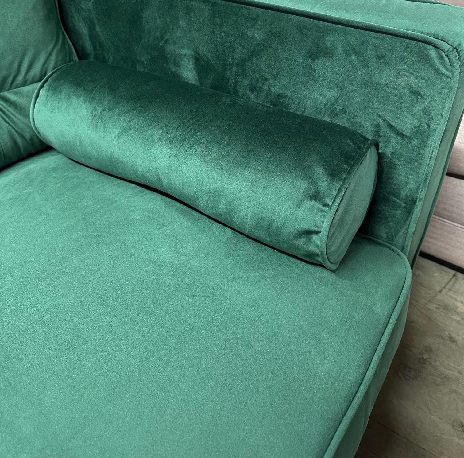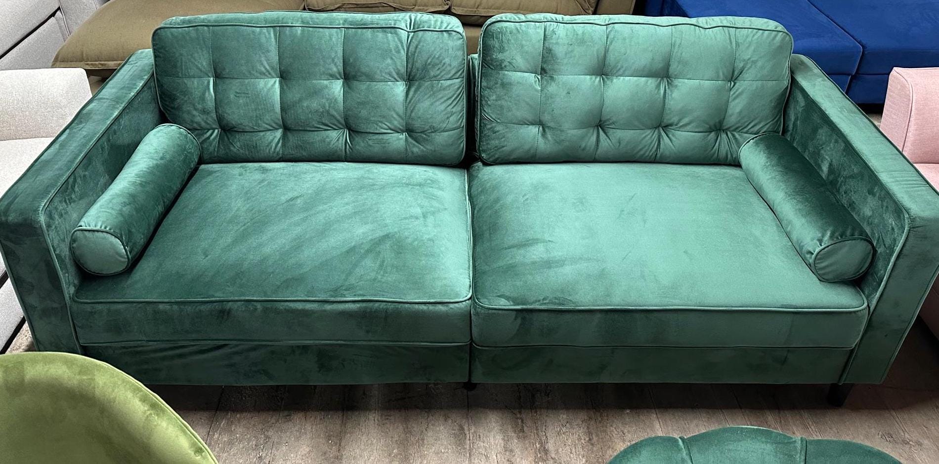 This elegant two-seater sofa is a stunning example of mid-century modern design, combining style, comfort, and functionality. Upholstered in a luxurious green velvet, the sofa features a button-back design that adds a touch of classic charm. The sleek black legs provide a contemporary contrast, while the two included cylinder-shaped cushions offer extra support and comfort.