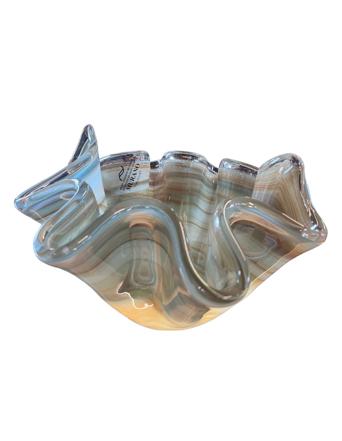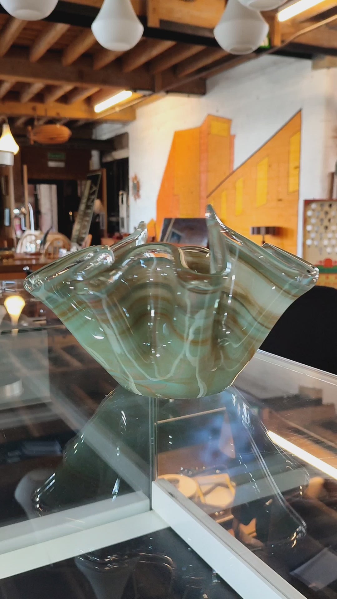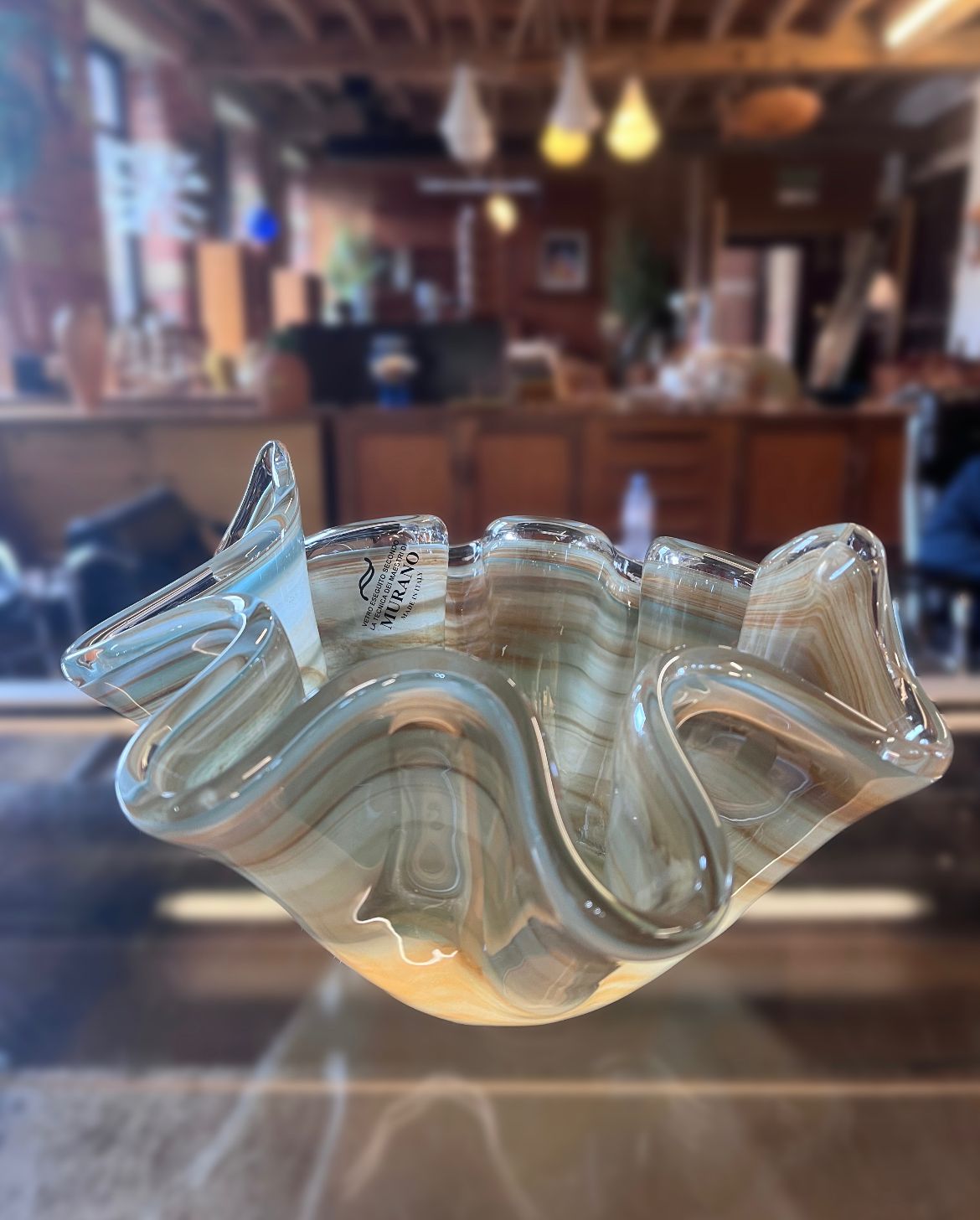 Add a touch of elegance to your home with our stunning Murano Handkerchief Crystal Vase. This handcrafted Italian vase has a unique ruffled edge that gives it a playful twist on a classic design. The grey/green finish adds a touch of glamour to any room, making it the perfect centre piece for your table or mantle. Plus, it's sturdy and won't easily tip over. Don't miss your chance to own this beautiful piece of art glass!
