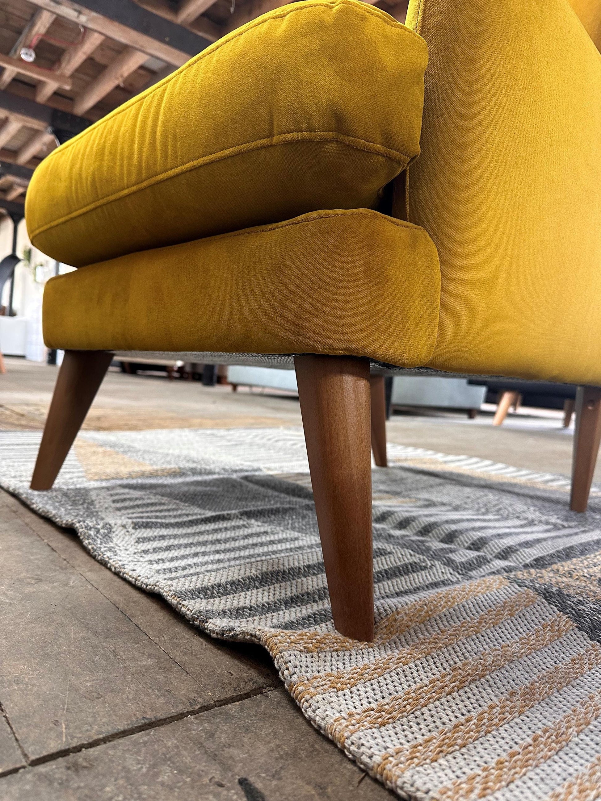 This luxurious mustard-coloured velvet high-back wingback chair effortlessly blends classic mid century modern design with contemporary elegance. Upholstered in soft, rich velvet, this chair offers a plush seating experience, while its high back provides excellent support and comfort. The distinctive wingback shape adds a touch of regal sophistication to any room, making it an ideal choice for your living space, office, or reading nook.