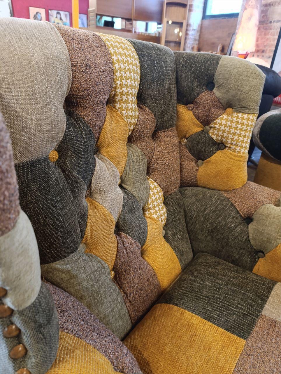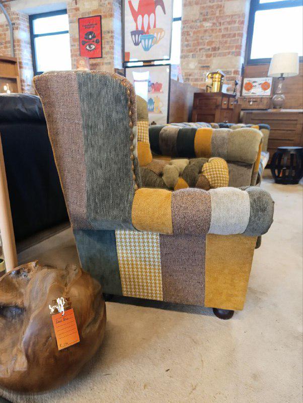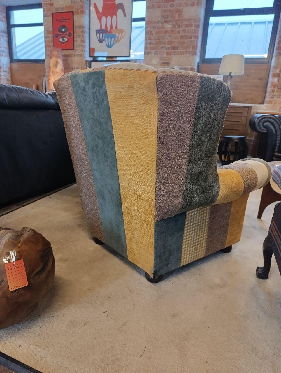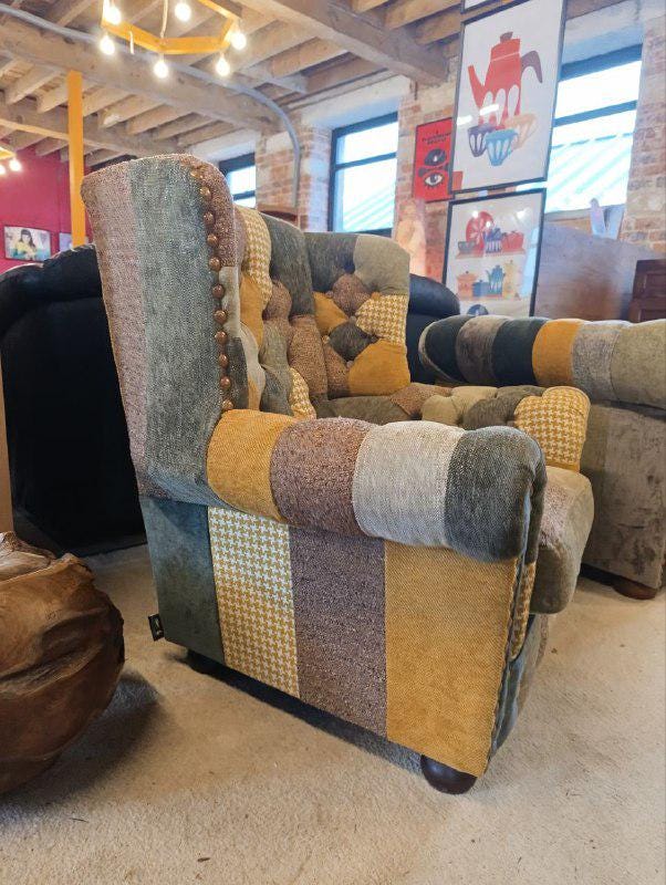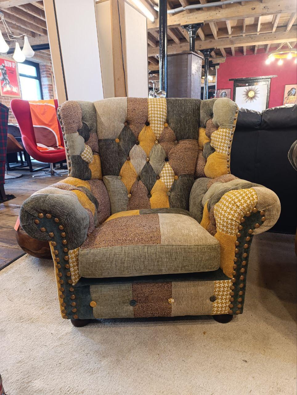 A very striking vintage armchair. Before its new upholstery, this chair served as a Chesterfield armchair in ox blood red. It has here been newly recovered in a very attractive harlequin style patchwork design, using hard-wearing fabric.