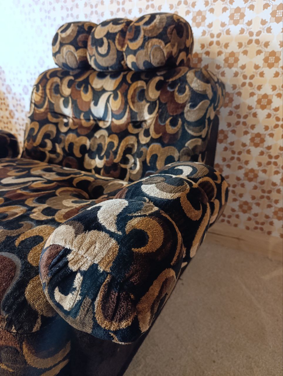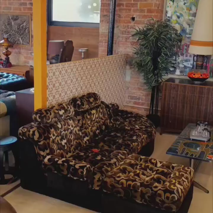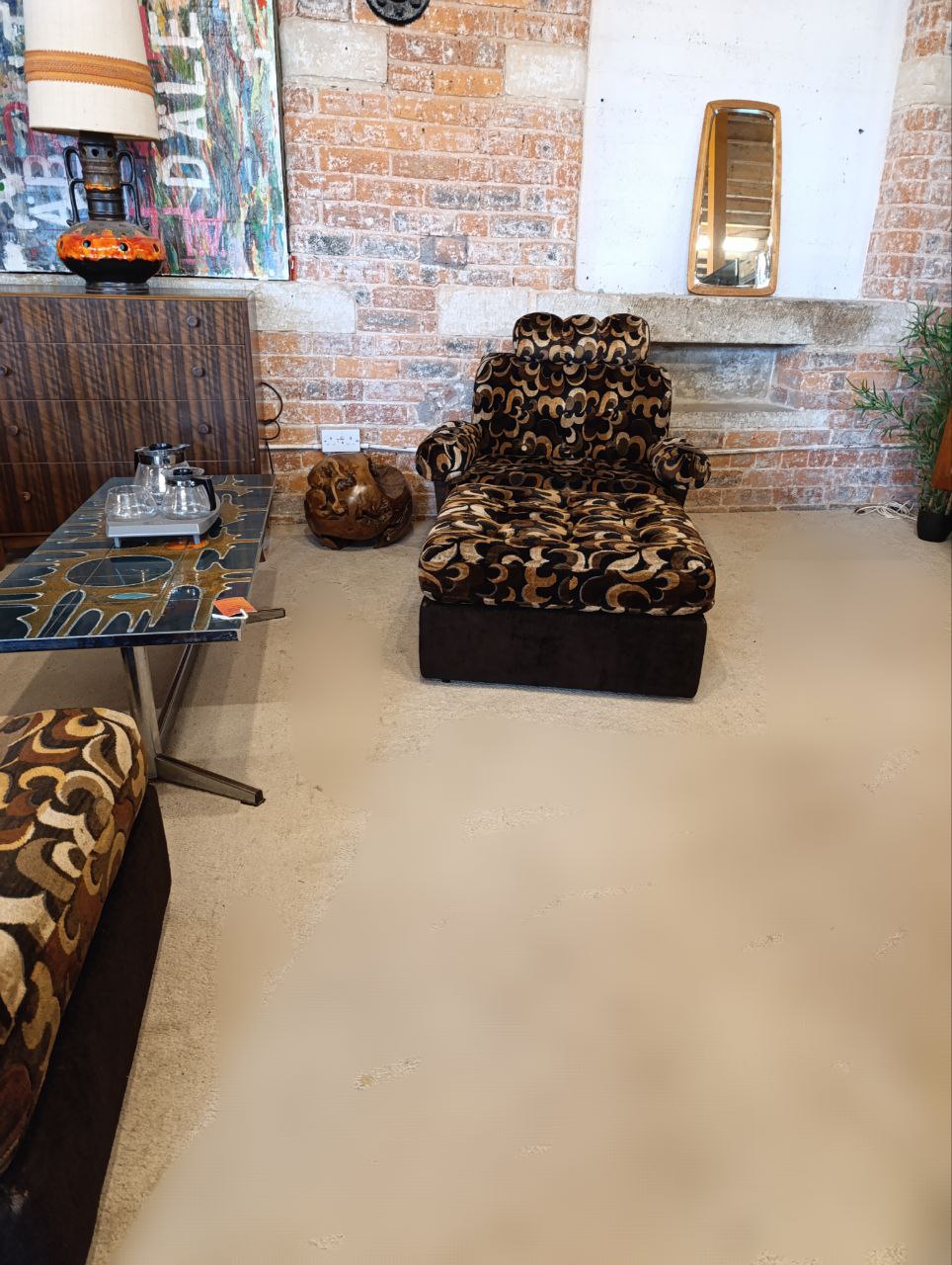 The set comprises a corner section, three armchairs, and two large pouffes with storage, offering ample seating and the option to arrange the pieces to perfectly suit your needs. The removable armrests and headrests further enhance its adaptability. The original patterned upholstery adds to its vintage charm, but for those seeking a more personalized touch, we offer a quotation for reupholstery in your choice of fabric.