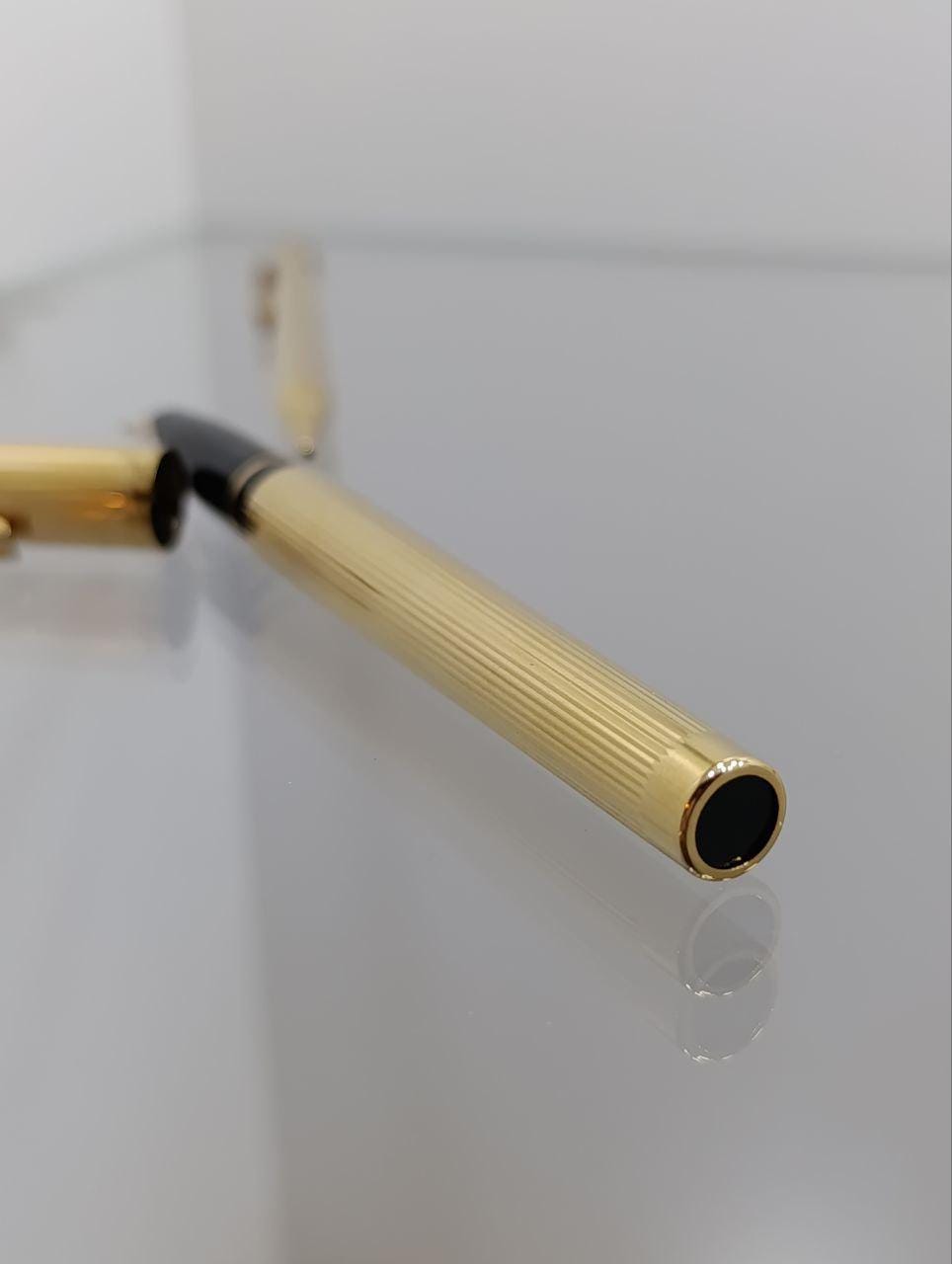 This vintage Sheaffer Targa Classic fountain pen and mechanical pencil set is a true collector's item. Finished in a beautiful fluted gold plate (pattern 1005), this set exudes timeless elegance. The fountain pen features a smooth-writing 14ct gold medium nib, while the mechanical pencil offers precise and effortless performance. Presented in its original box with the original manual and guarantee stamped 1988, this set is in excellent condition with only minor signs of wear.