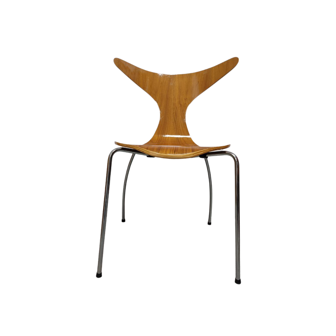 We are delighted to offer you this beautifully stylish Danish dining chair. The chairs are made from plywood with a stunning teak veneer, boasting a very striking patina. The seat sits on top of chrome legs. The chairs are iconic vintage 1990's Danish Dolphin chairs designed by Bjarke Nielsen for Dan-Form.