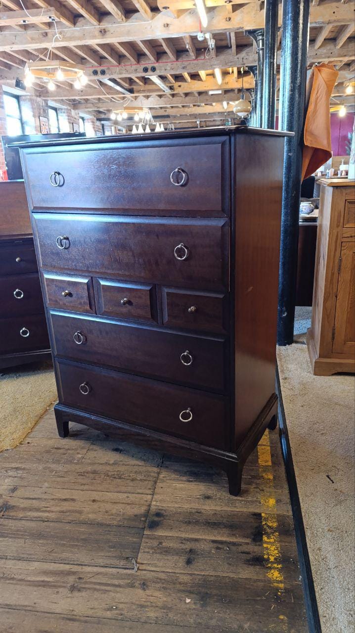 Elevate your home with this stunning and functional vintage STAG Minstrel Tall Boy, a classic piece of British craftsmanship, designed to bring both timeless style and practical storage to any room. Imagine this luxurious mahogany chest of drawers gracing your bedroom, living room, home office, hallway, or even your dining room, its rich tones and elegant lines creating an atmosphere of refined retro charm.
