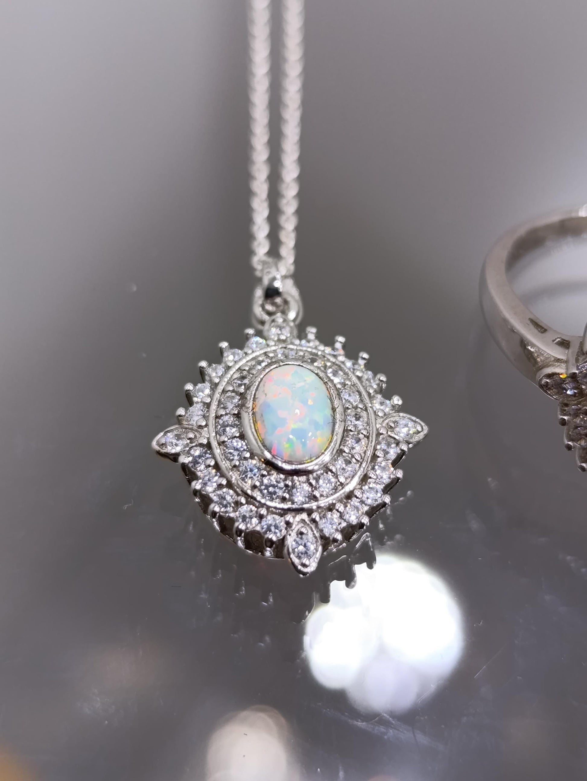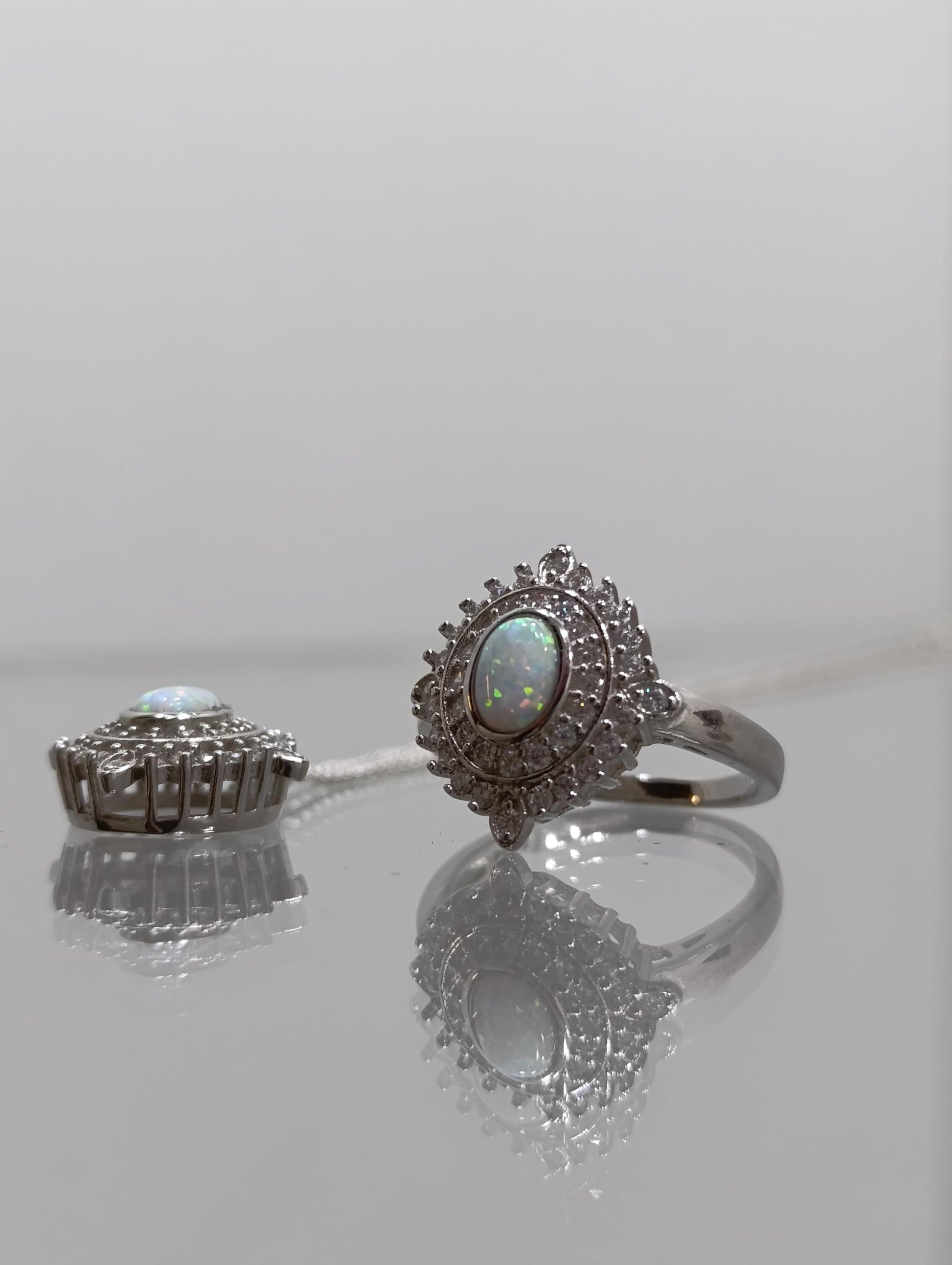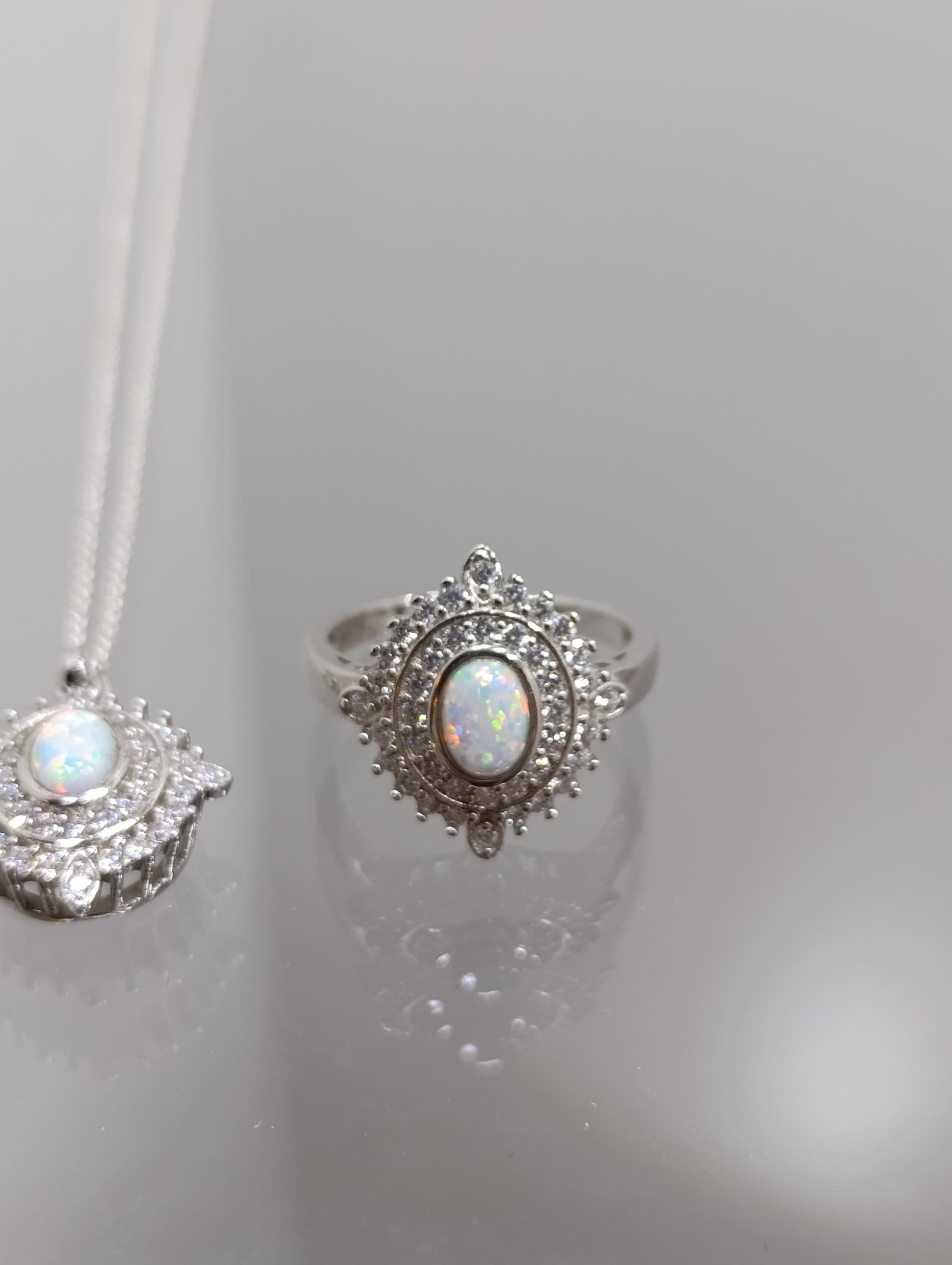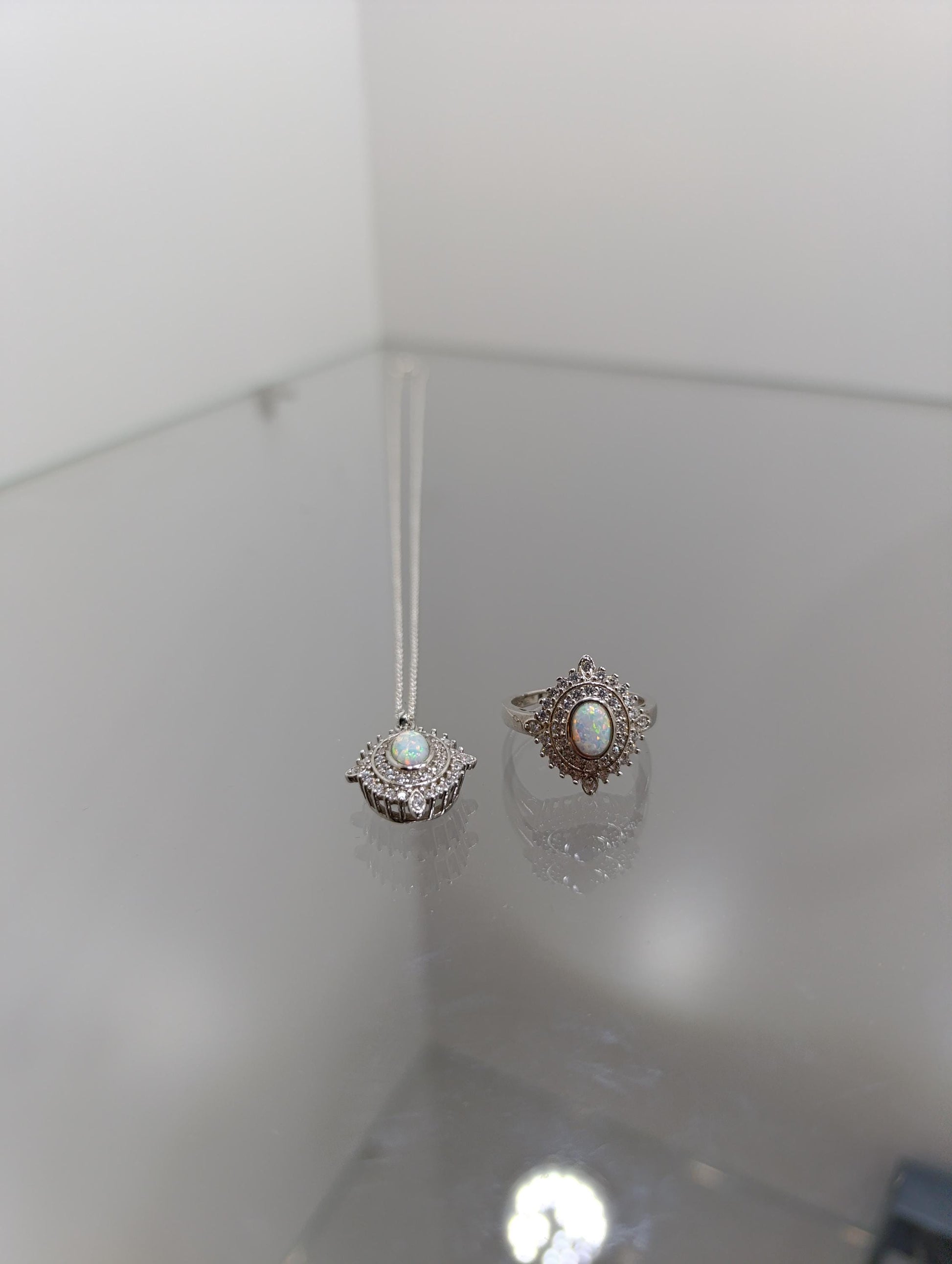 Sterling Silver Fire Opal Halo Ring and Necklace