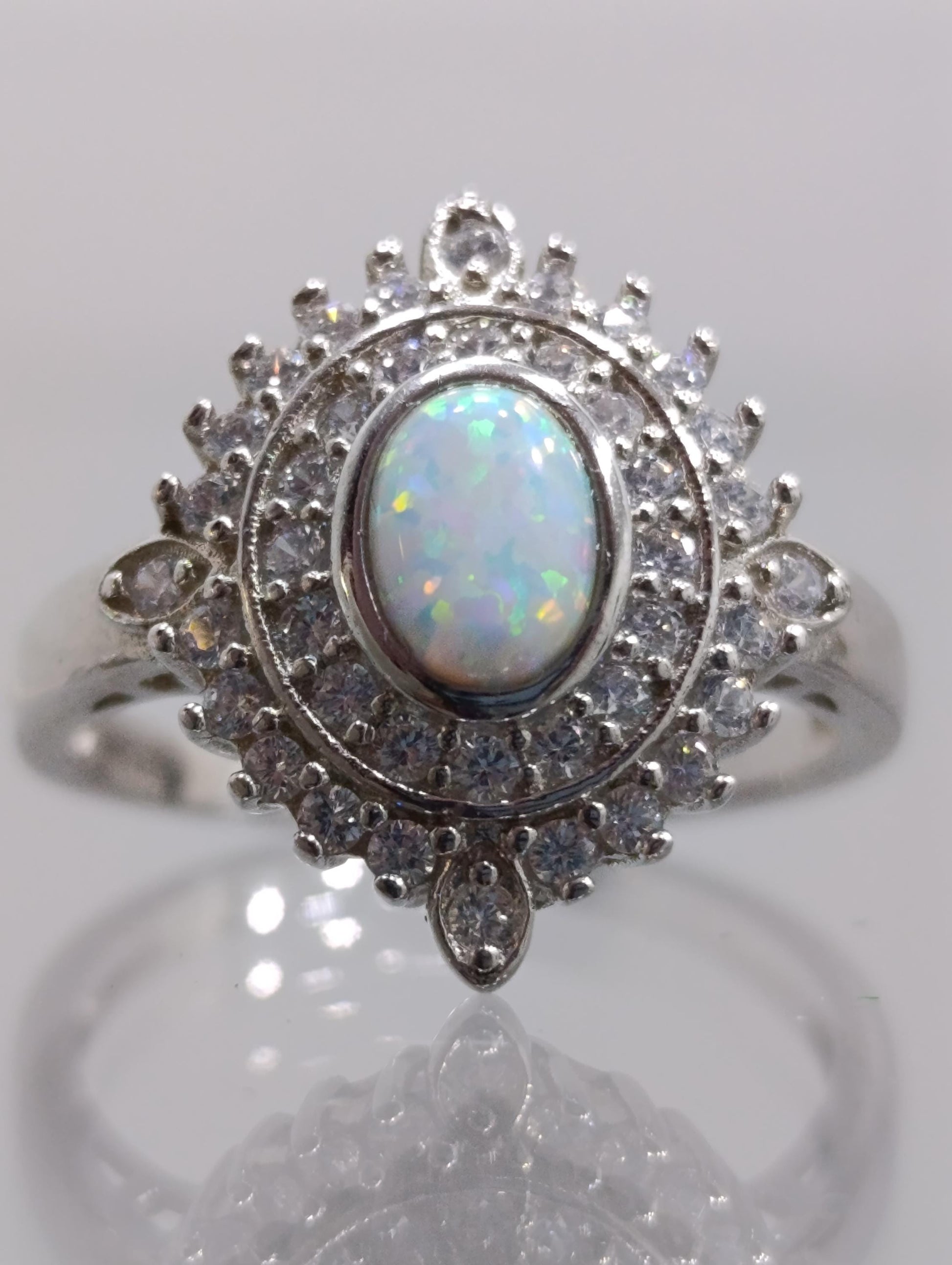 This elegant fire opal ring is a beautiful blend of subtle shimmer and captivating sparkle. The fiery orange cabochon fire opal, sourced from Mexico, is the star of the show, surrounded by a halo of shimmering stones. Crafted from solid sterling silver and finished with rhodium plating for an anti-tarnish effect, this ring is perfect as an engagement ring, a wedding band, or a unique October birthstone gift.