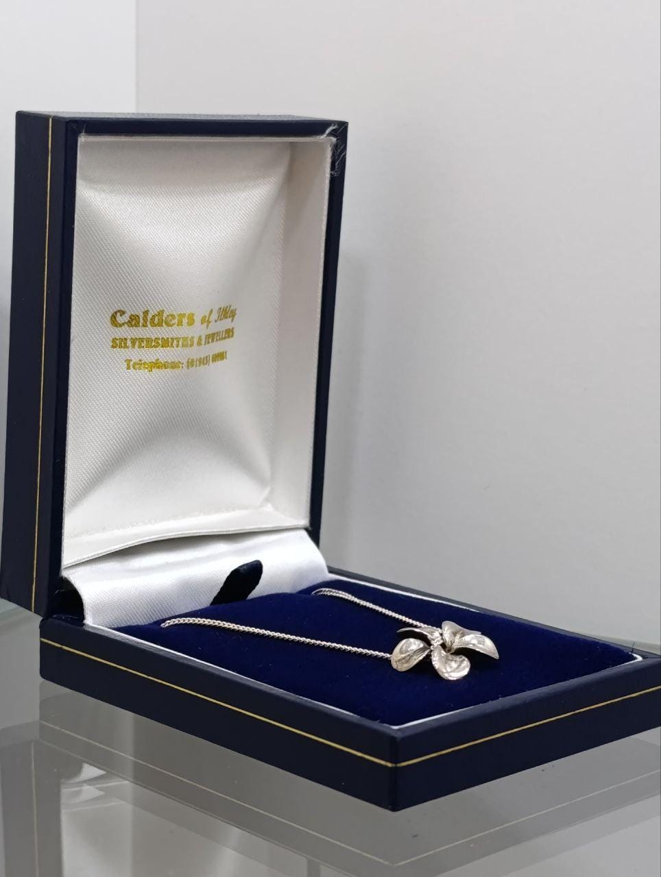 This delicate sterling silver necklace features a simple yet charming forget-me-not flower pendant with five petals. The pendant hangs gracefully from a classic 18-inch loop chain. This necklace is a perfect gift for a wife or mother, symbolizing love, remembrance, and enduring affection. It's in excellent, as-new condition, ready to be treasured for years to come.