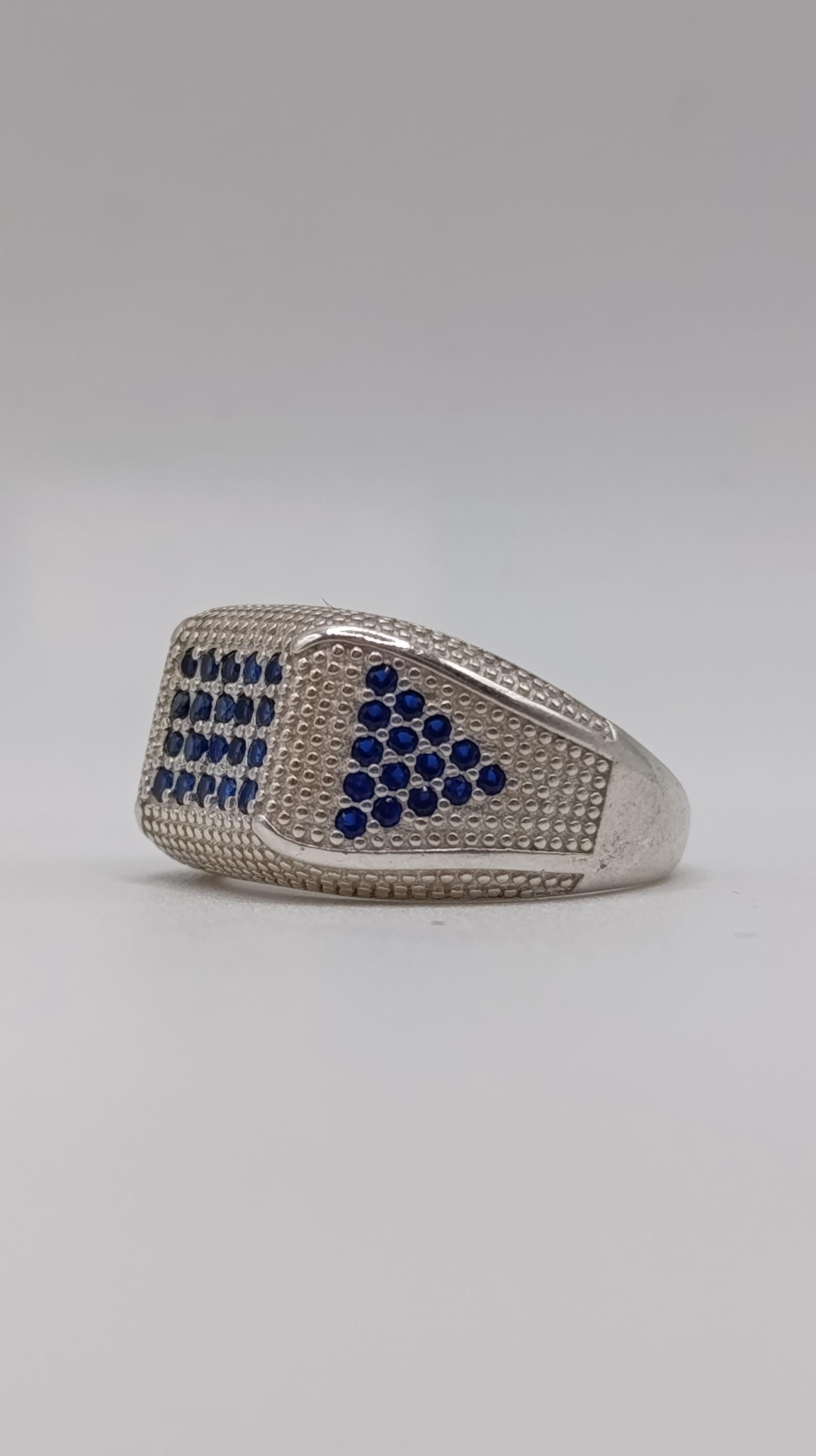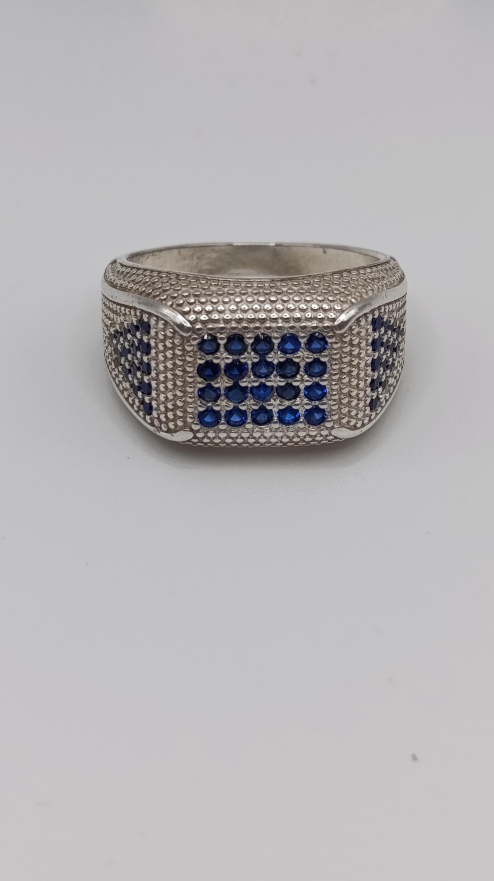 The lighter blue tone of the sapphires creates a refined brilliance against the textured silver ground, offering an eye-catching design that balances strength and elegance. A versatile piece suitable for both men and women, whether worn as a statement ring or as part of a jewellery collection.