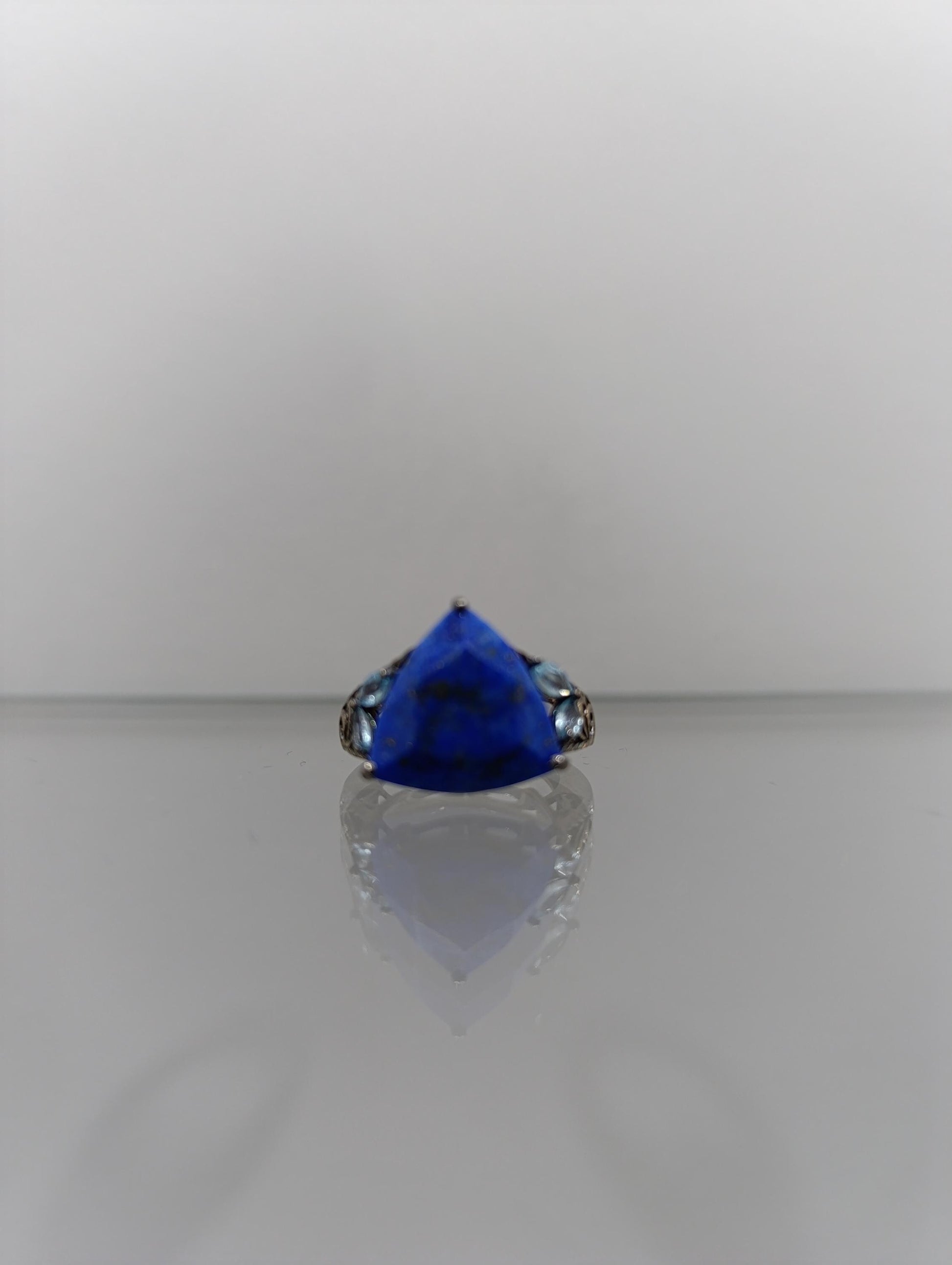 This vintage ring is a stunning statement piece, crafted from sterling silver. The elegant band features a substantial Lapis lazuli stone and two light blue stones on either shank. This ring is perfect for adding a touch of glamour to any occasion.
