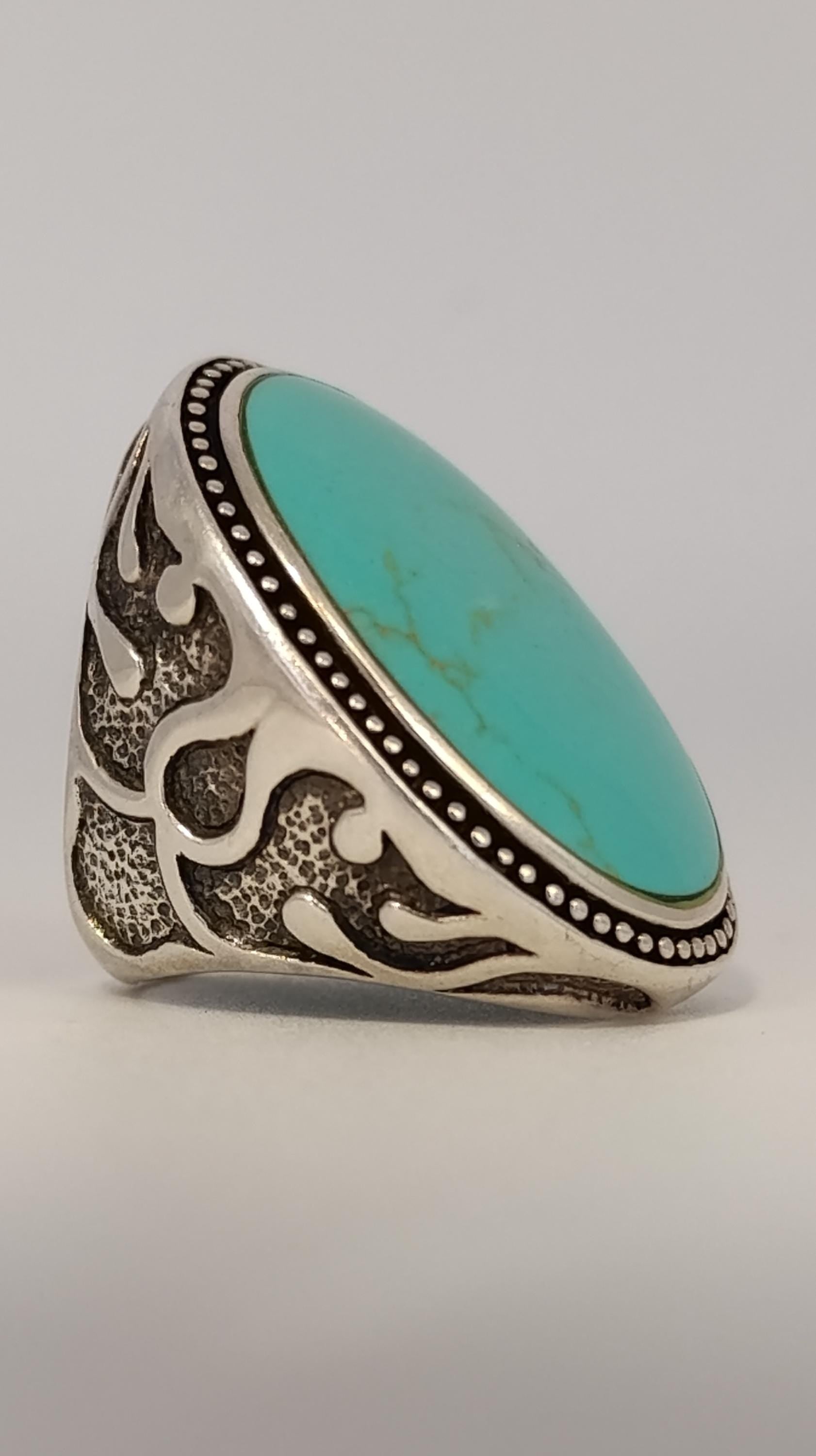 A bold and substantial sterling silver ring, stamped 925 with additional hallmarks, set with a large turquoise (Feroza) cabochon. Weighing 18.08 grams, this impressive piece has presence and quality, making it both a striking accessory and a collectible silver jewel.