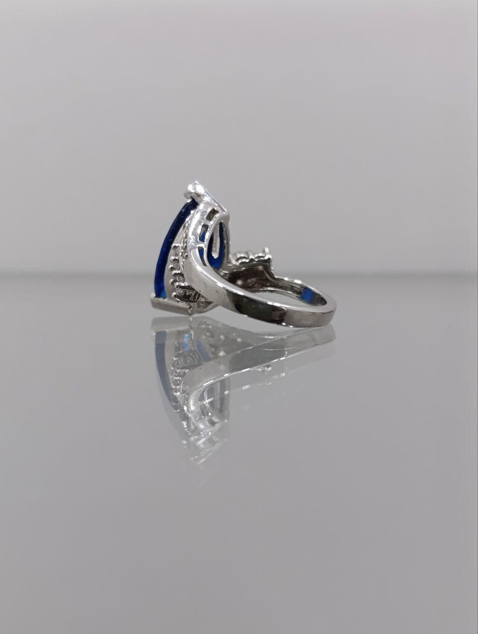This striking sterling silver ring features a captivating 6ct deep blue synthetic sapphire as its centrepiece. The sapphire is beautifully accented by sparkling cubic zirconia diamonds in a pave setting, adding a touch of brilliance and glamour. This ring is a bold and elegant statement piece, perfect for those who love vibrant colour and sparkle.
