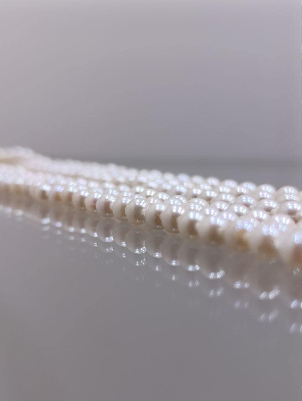 This stunning pearl necklace features three graduated strand of luxurious Japanese Okoya pearls. Each pearl measures a generous 4.5mm, creating a dramatic and elegant effect. The pearls are meticulously hand-knotted and secured with a beautiful white gold clasp. This 20-inch necklace is in very good condition and comes presented in its original box, making it an ideal gift for a loved one or a special treat for yourself.
