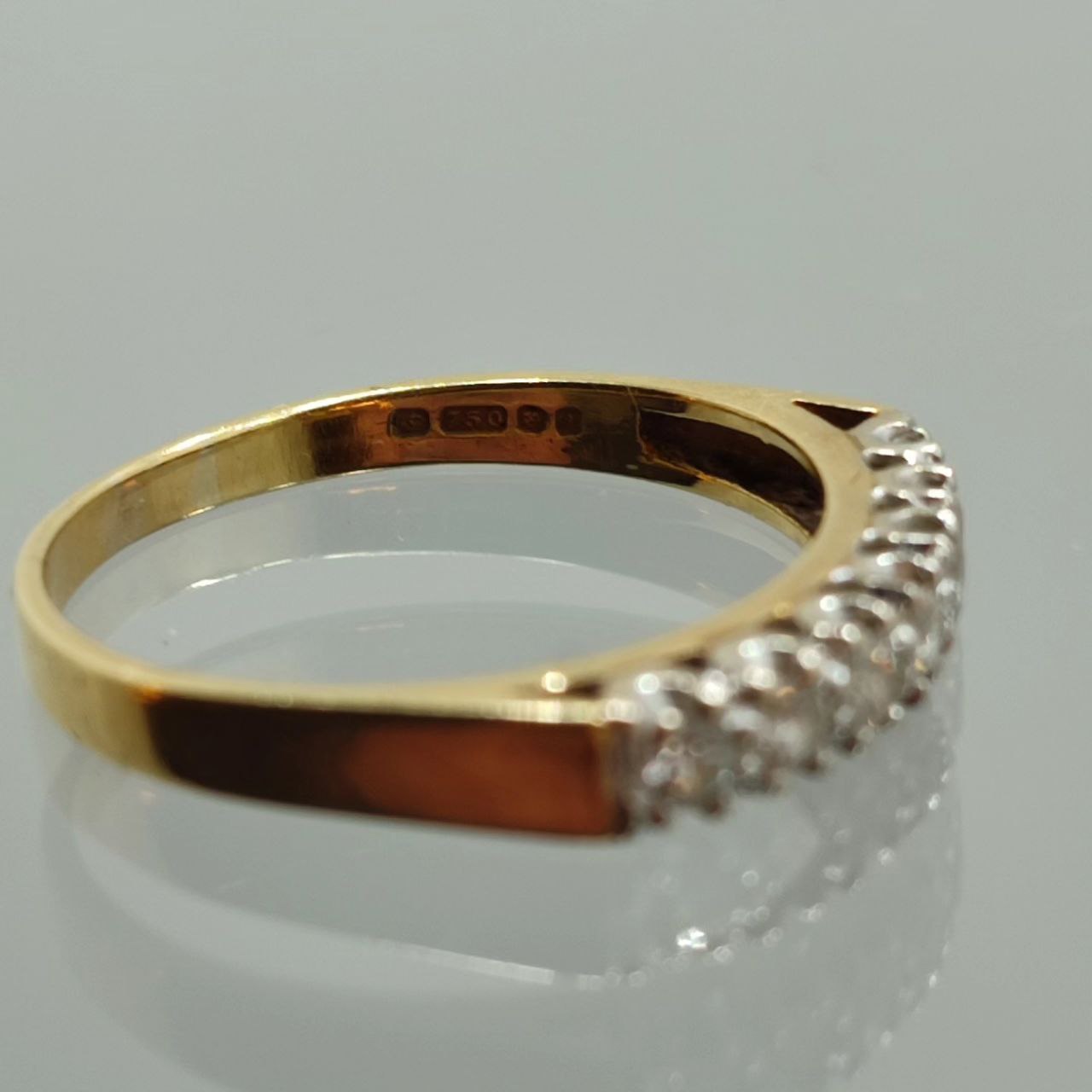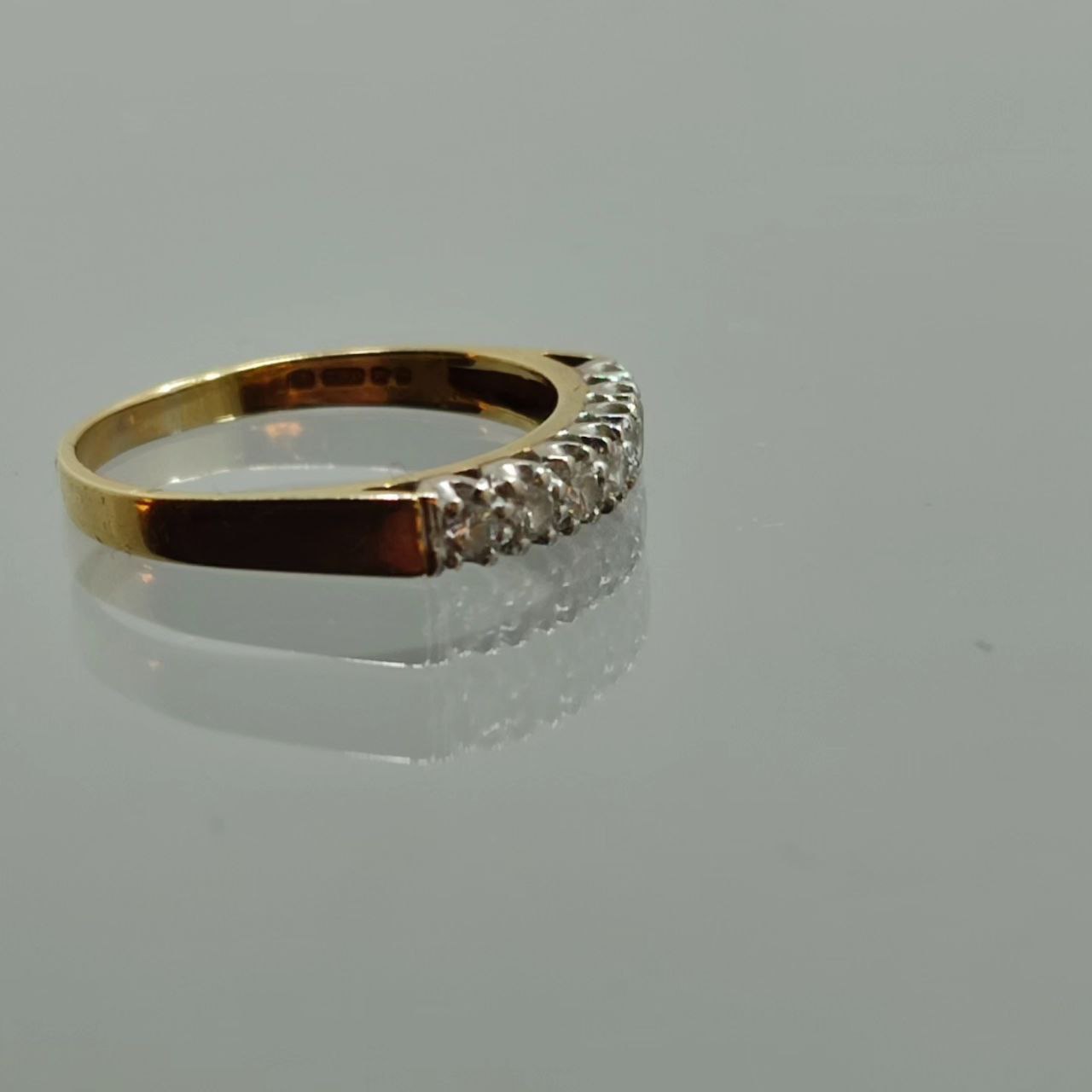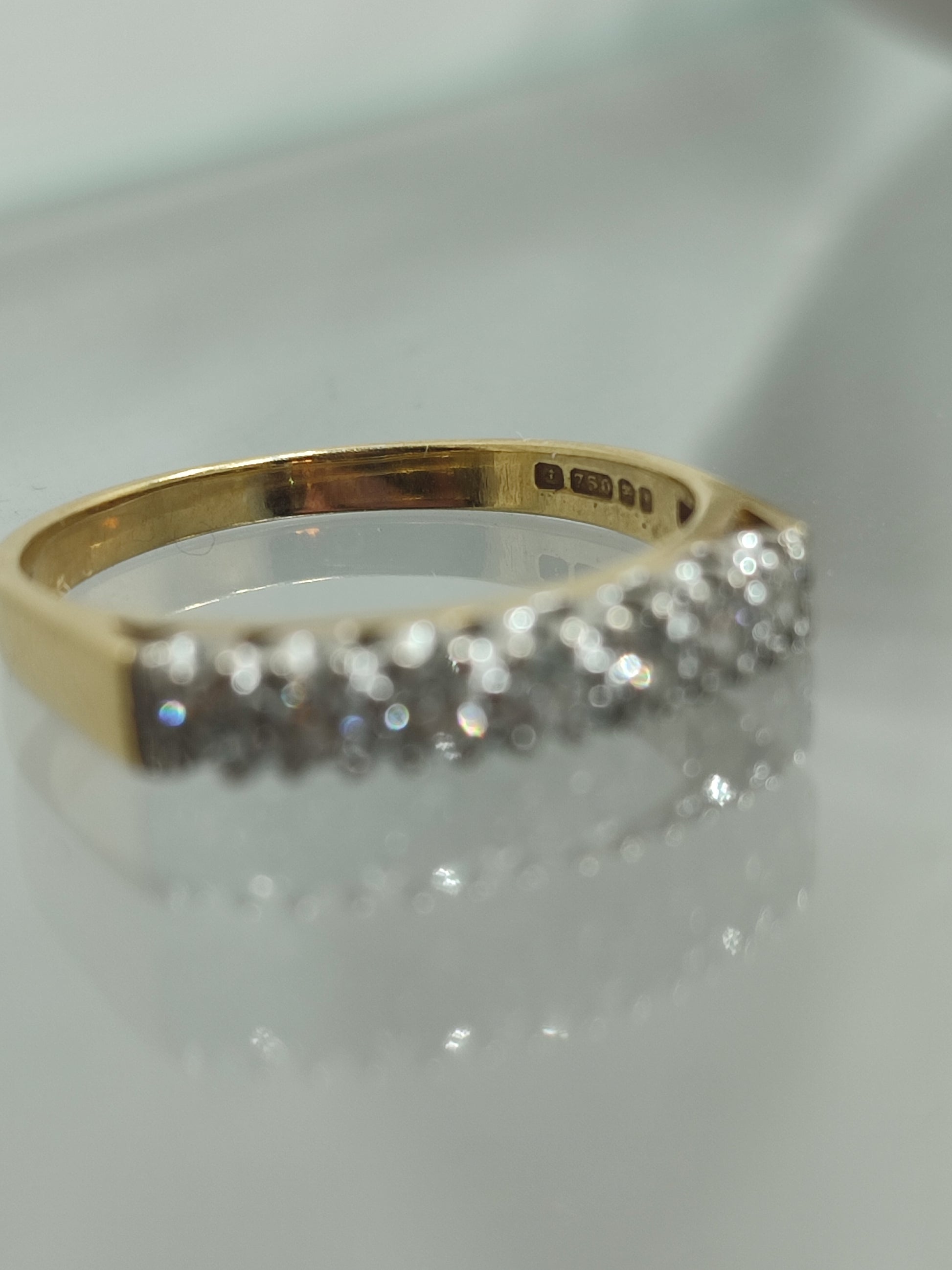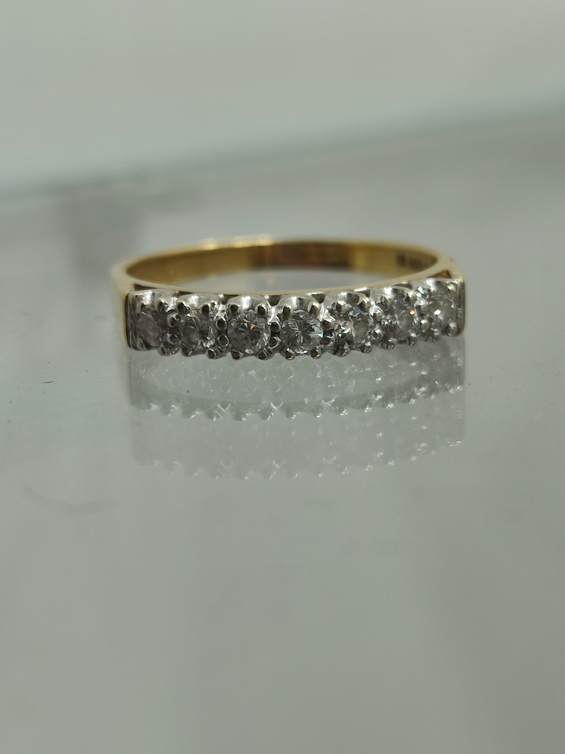 Embrace timeless elegance and radiate sophistication with this exquisite seven-stone diamond half hoop eternity ring. Capture the allure of timeless beauty with seven sparkling brilliant-cut diamonds, meticulously point-set to create an unbroken line of shimmering brilliance. This captivating ring embodies the epitome of luxury, crafted from exquisite 18ct gold, ensuring a luxurious presence on any finger. The ring's weight is 1.8 grams.
