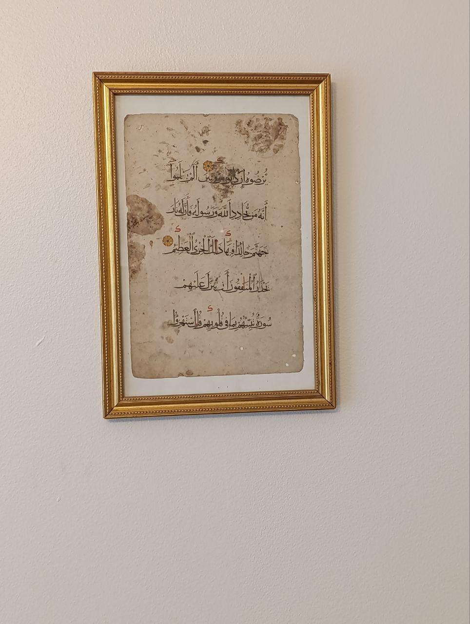 The two folios contain verses from Surah At-Tawbah: the first folio covers Quran IX, Verse 62 to Verse 64, while the second spans Verse 64 to Verse 66. Ink smudges and foxing add a unique historical charm, offering collectors a glimpse into the centuries-old journey of these sacred texts. Such items are incredibly rare, making them an invaluable piece for collectors of Islamic art, history enthusiasts, and anyone looking to adorn their space with a tangible link to Islamic heritage.