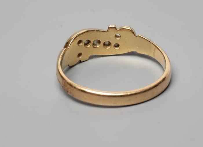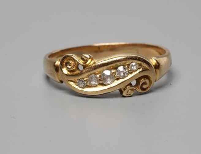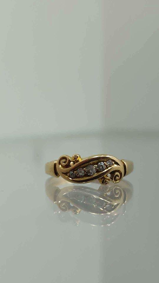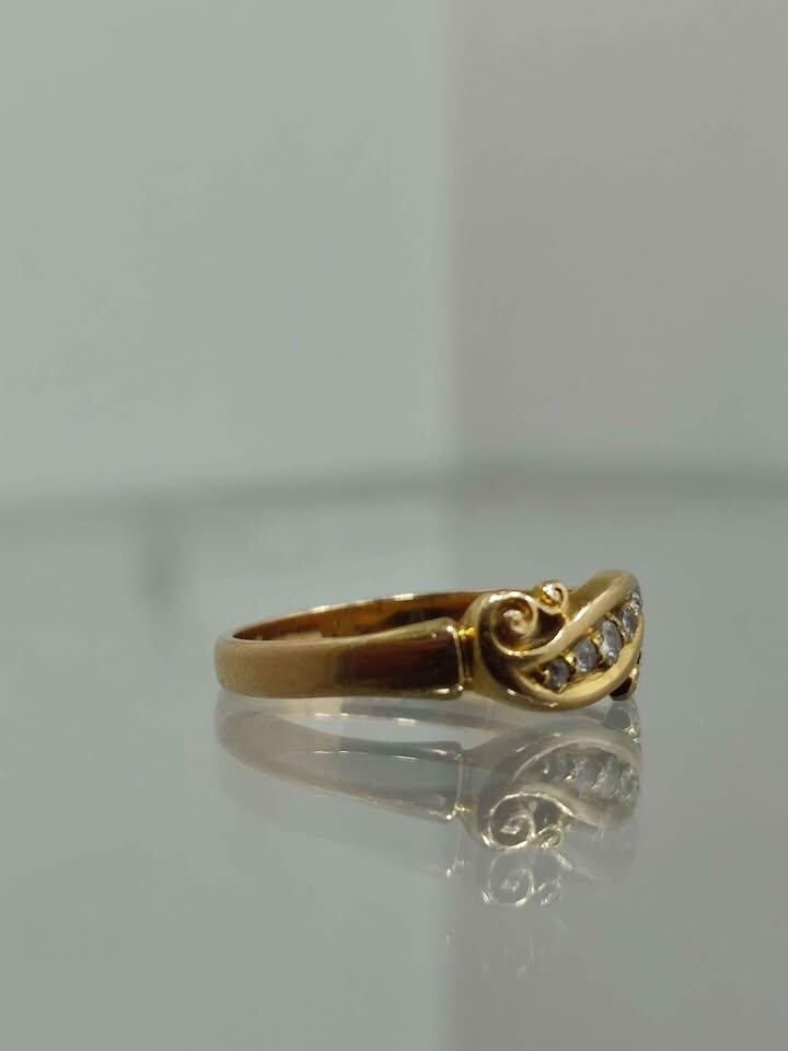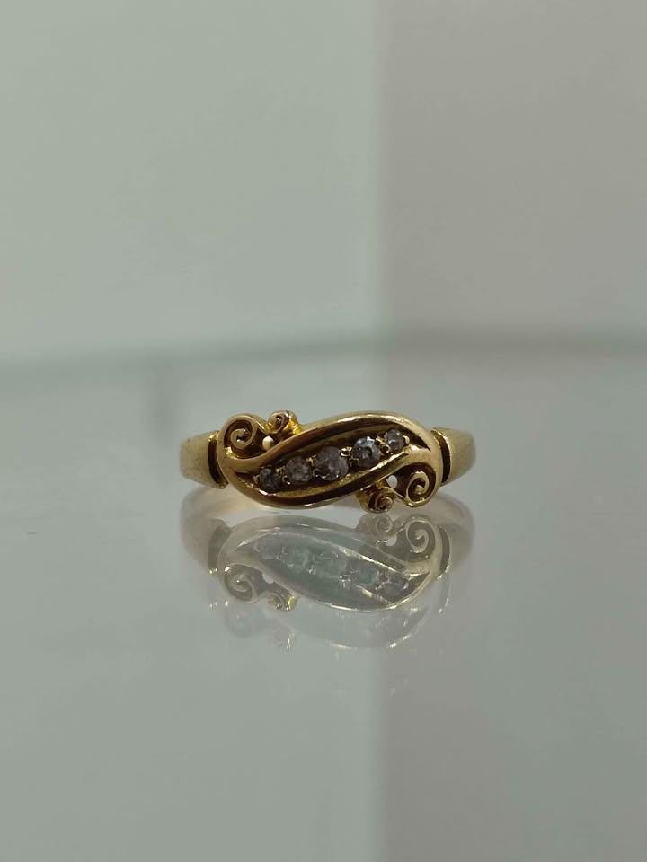 This very stylish late Victorian diamond ring is a captivating piece of jewellery history. Five sparkling rose-cut diamonds are set in a beautiful crossover design, accented by intricately carved scroll shoulders that add a touch of elegance. The diamonds catch the light beautifully, creating a subtle shimmer that complements the ring's delicate design.