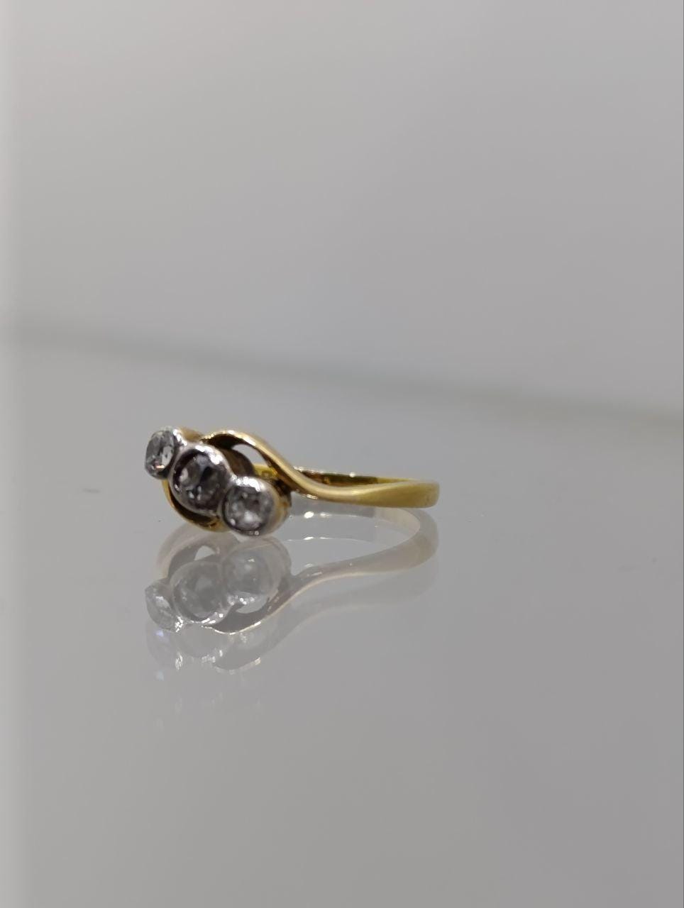 This elegant vintage ring features a beautiful crossover design crafted from luxurious 18ct yellow gold. Three sparkling diamonds are set in the crossover, creating a timeless and sophisticated look. This ring is a perfect choice for an engagement ring, anniversary gift, or a special treat for yourself. It is stamped 18ct and tested as such. The design and craft make it a circa 1970 ring.
