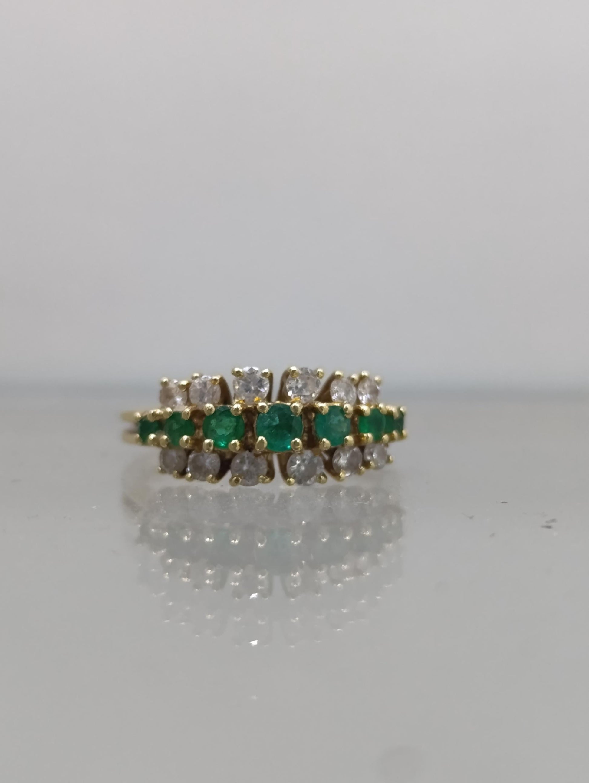 Discover the enduring sparkle and rich elegance of this stunning vintage 18ct yellow gold ring. Imagine this captivating piece gracing your hand, its vibrant emeralds and dazzling diamonds radiating a sophisticated glow that complements any occasion. This ring is more than just jewellery; it's a timeless treasure, designed to inspire joy and bring a touch of vintage luxury to your collection.