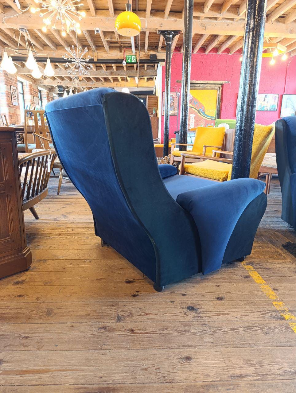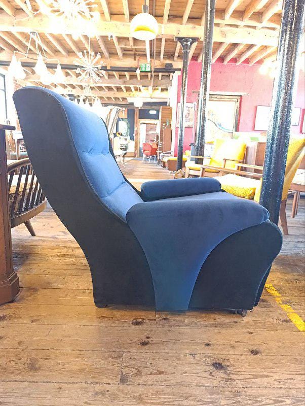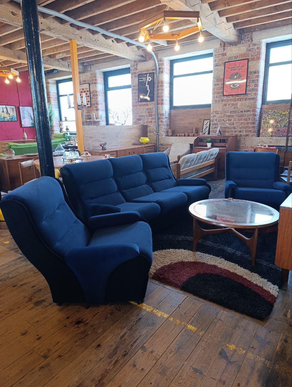 Step into a world of unparalleled comfort and iconic retro style with this stunning vintage three-piece suite, dating from the 1970s. Imagine sinking into its incredibly generous cushioning, enveloped in luxurious new upholstery featuring a captivating contrast of ocean blue on black velvet. This suite, with its distinctive retro arms and inviting design, is more than just furniture; it's a haven for relaxation, promising to bring joy and sophisticated comfort to your living space.