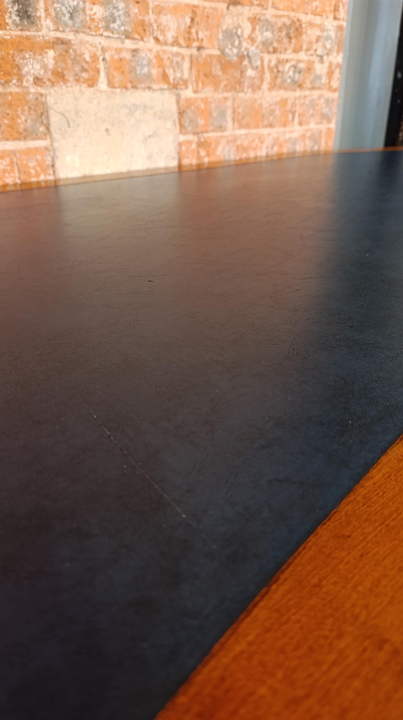 The desk's generous blue vinyl top offers an ample surface for all your needs, easily accommodating two to three monitors and other hardware. It's thoughtfully designed for organization, featuring deep drawers with dividers and a dedicated filing cabinet. The back panel, finished in matching veneer, allows for versatile placement-either against a wall or as a commanding centerpiece in the middle of a room.