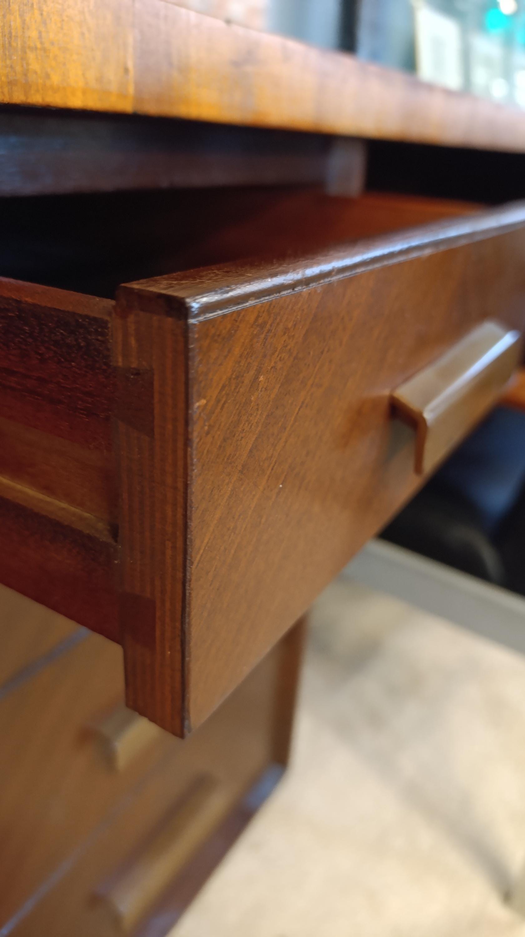 Transform your workspace with this exceptionally unique and stylish vintage desk from the 1970s. Imagine the sense of inspiration and sophistication as you work at this impressive piece, its distinctive aircraft-wing shape and beautiful teak and rosewood veneer exuding a timeless retro charm. This desk is more than just a piece of furniture; it's a very rare find that provides the perfect balance of classic style with modern functionality.