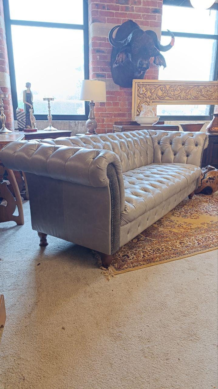 A striking vintage Chesterfield style sofa upholstered in genuine grey leather. Featuring the iconic deep button tufted backrest, rolled arms and generous proportions, this piece brings timeless sophistication with a modern twist. The soft grey tone makes it versatile for both classic and contemporary interiors, while the leather adds durability and luxury. Ideal for a living room, office, or statement seating in a stylish interior.