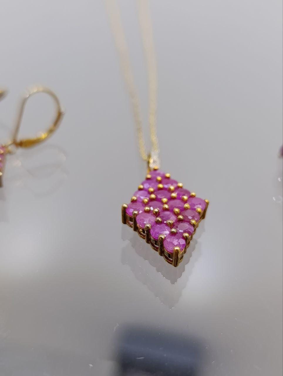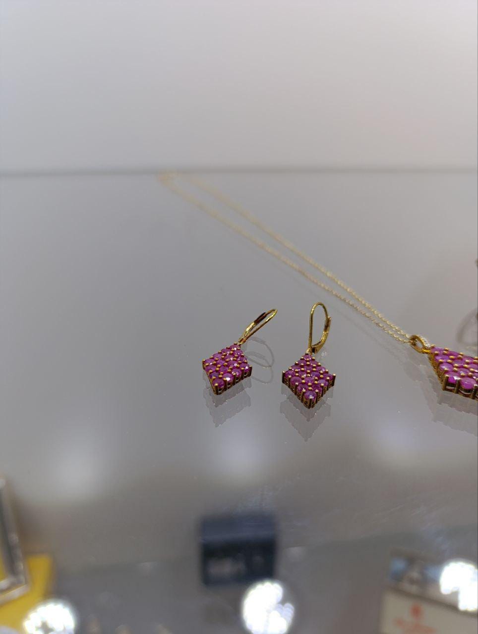 This stunning vintage jewellery set by Jacmel Mauritius is a true testament to elegance and craftsmanship. The set includes a pair of earrings, a ring, and a necklace with a matching pendant, all crafted from 925 silver with gold plating. Each piece features a diamond-shaped frame adorned with sixteen shimmering stones, possibly African rubies, creating a dazzling display of sparkle. The ring, size M, is further embellished with cubic zirconia and marcasite on the shank. This high-quality set is a perfect addition to any jewellery collection and a beautiful way to add a touch of vintage glamour to any occasion.