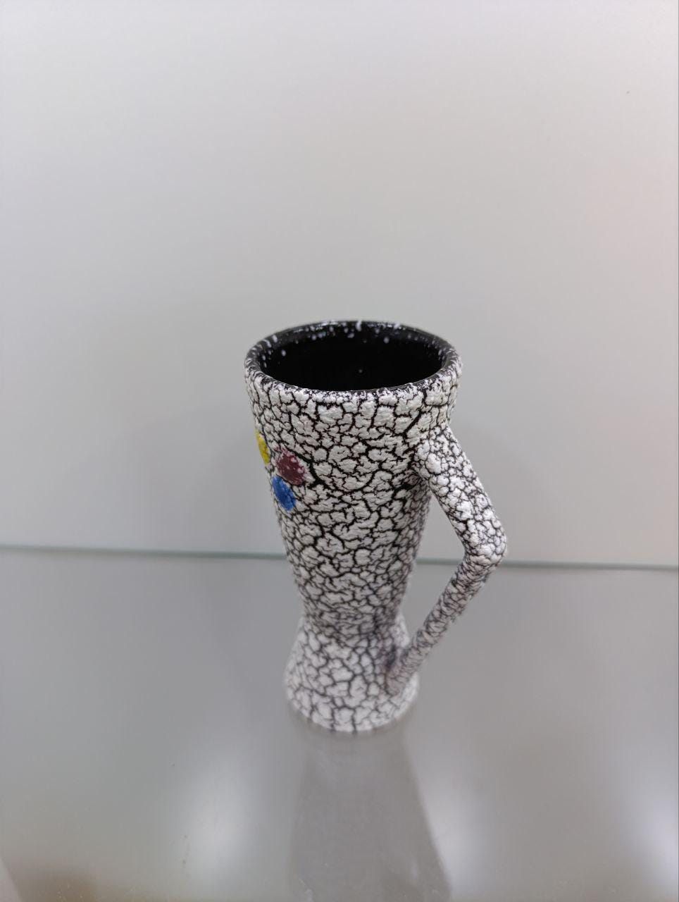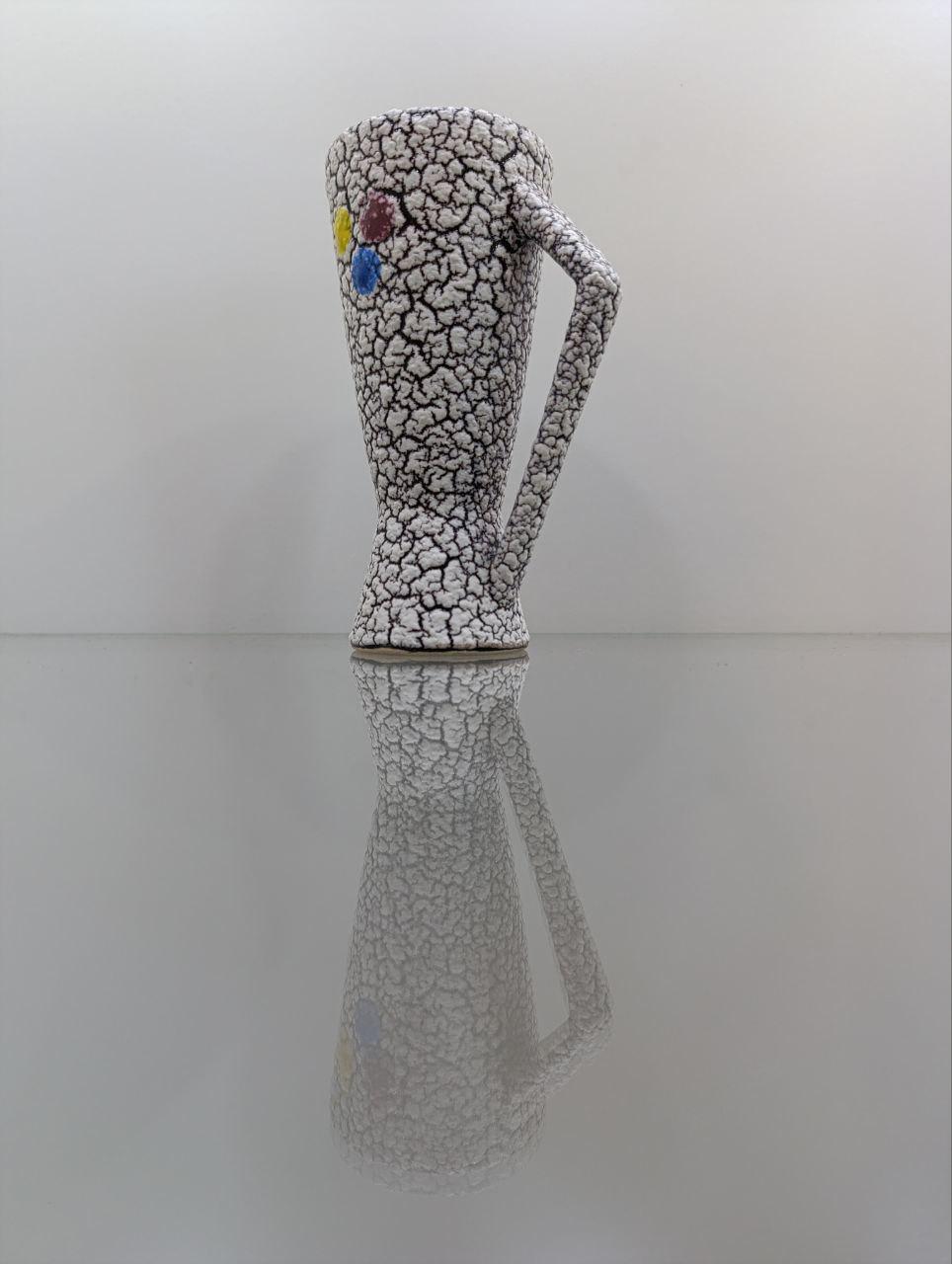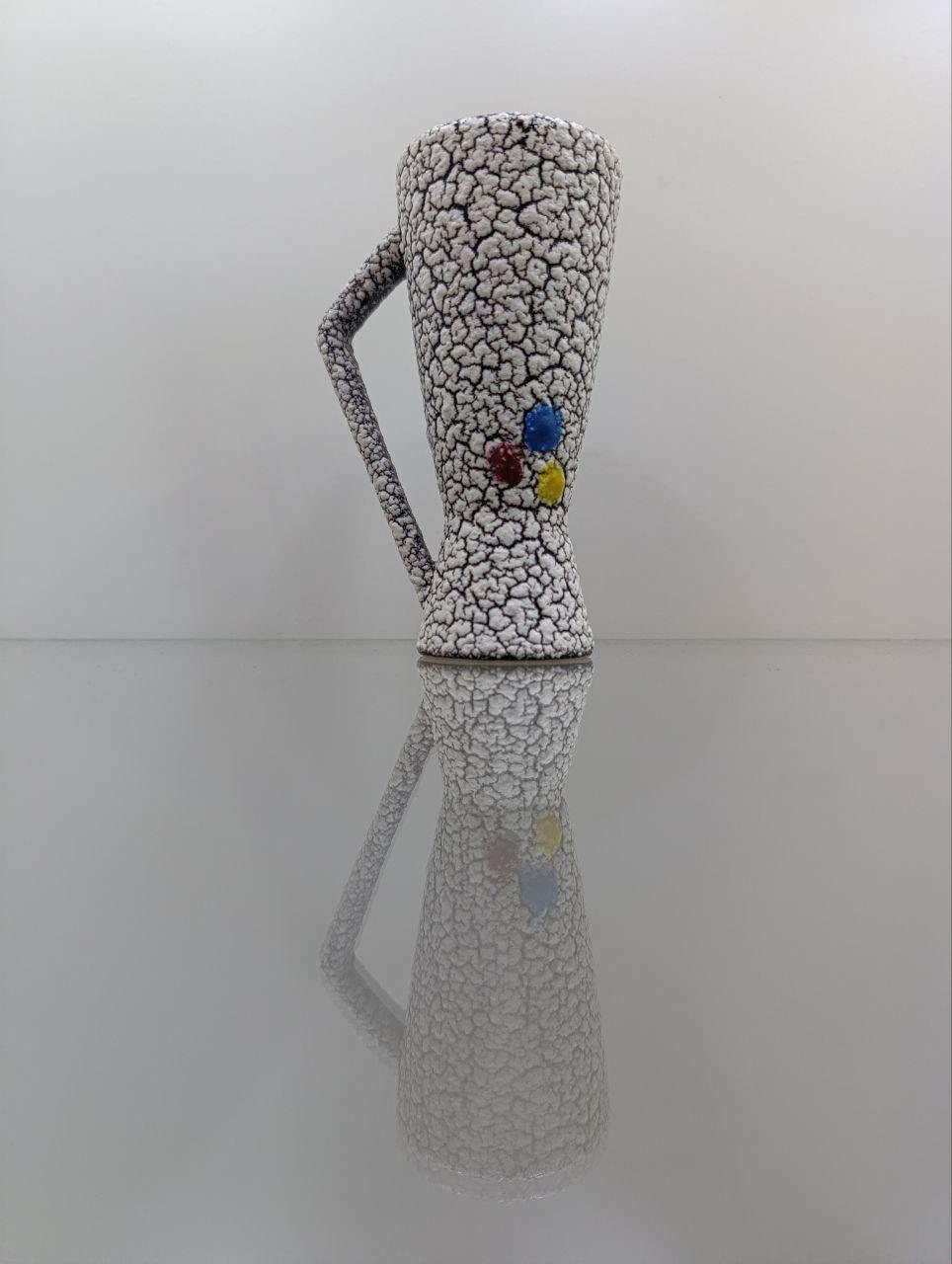 This rare vintage ceramic vase by Jopeko, West Germany, is a stunning example of 1950s design. With its unique shape, shrink glaze texture, and vibrant primary colours, this vase is a true statement piece. The white handle adds a touch of elegance, while the overall design exudes mid-century modern charm. This collectable piece is in excellent condition and ready to add a touch of retro style to any home.