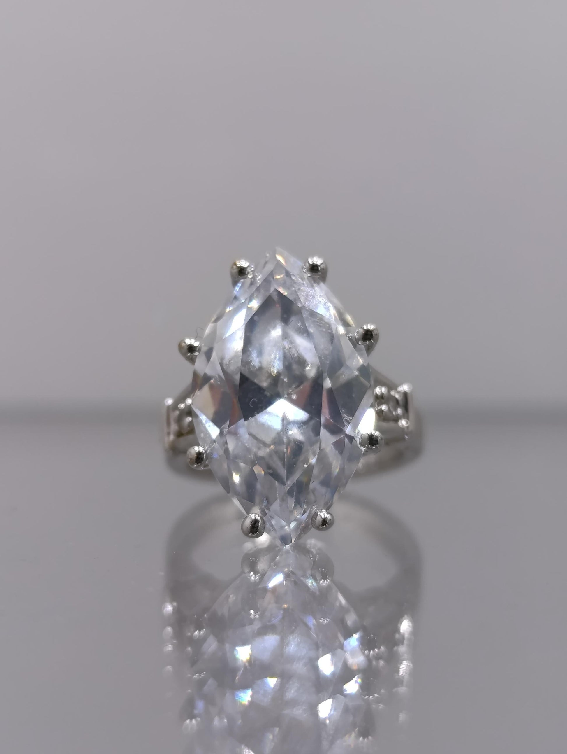 This vintage solitaire ring is a stunning statement piece, crafted from sterling silver. The elegant band features a huge 4ct sparkling cubic zirconia stones. This ring is perfect for adding a touch of glamour to any occasion.