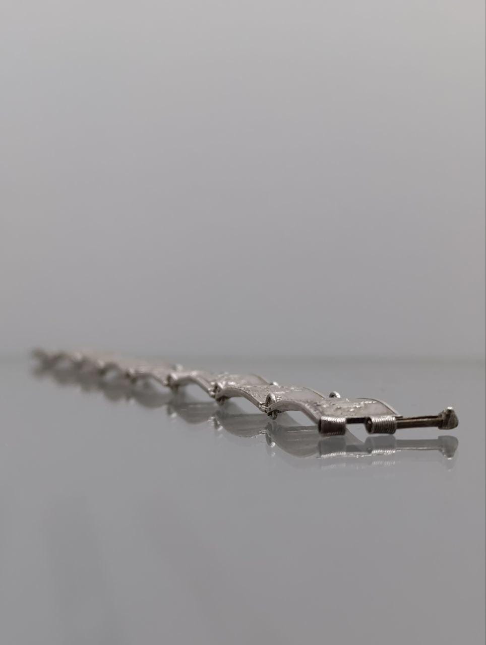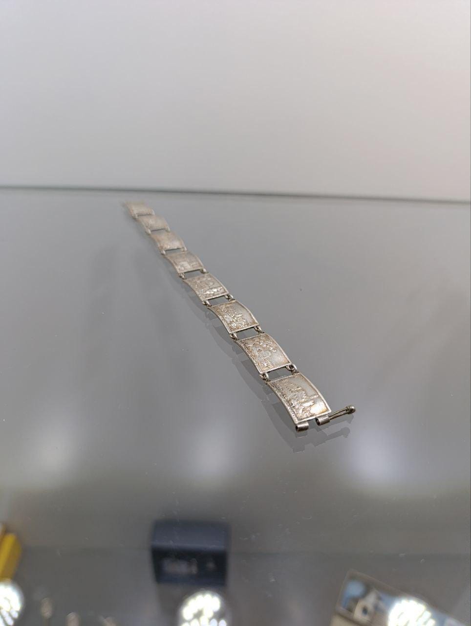 This beautifully handcrafted sterling silver panel bracelet is a unique piece of antique jewellery dating back to the mid-20th century. Each panel depicts a notable site within Jerusalem, a city sacred to Jews, Christians, and Muslims, including the Wailing Wall, the Church of the Holy Sepulchre, and the Dome of the Rock. This bracelet is a testament to the rich history and cultural significance of Jerusalem.